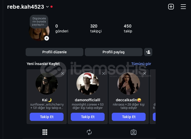 Hesabın kullanıcı adı = rebe.kah4523Hesabın Takipçi sayısı =320hesabın Bölgesi = Türkiyehesaba kayıtlı bağ = e-posta tek bağHesap hakkında bilgilendirme = Merhaba efendim tekrardan bu hesap gerçek takipçili hesapdır aralarında yabancılarda vardır öncelikle bilginizeve hesabı mail ile devrediyoruz ayrıca hesapda yapacağınız veya ban ...