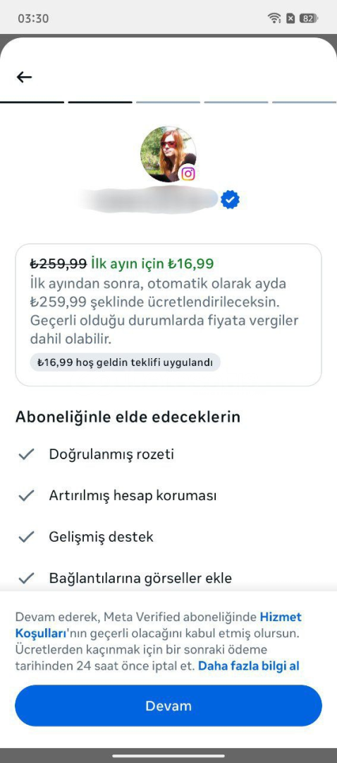 META VERIFIED için alacak kişinin, abonelik satın aldıktan sonra: (Hesapta herhangi bir değişiklik yapılmalıdır.)