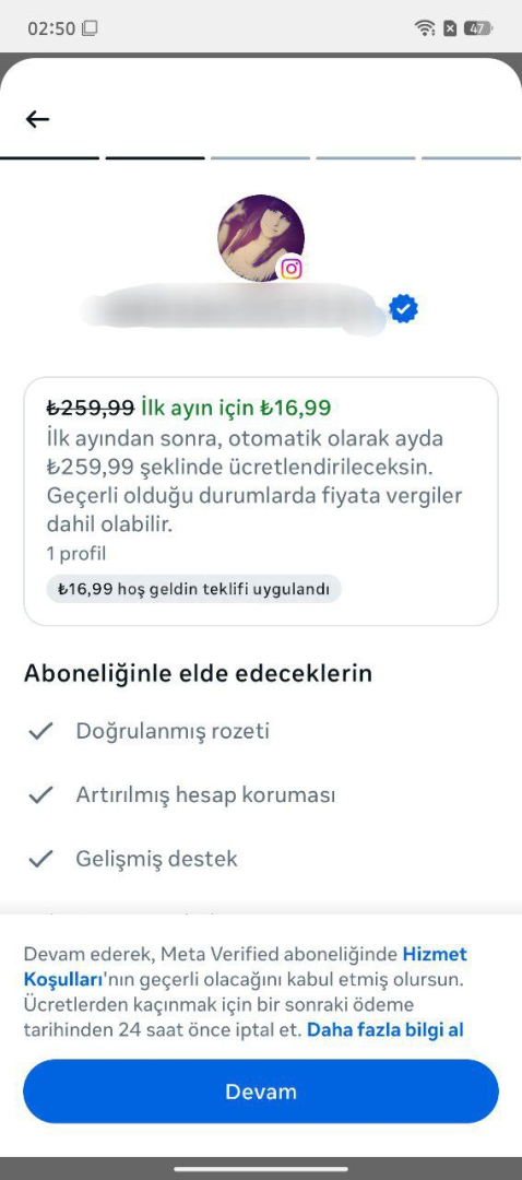 • META VERIFIED için alacak kişinin, abonelik satın aldıktan sonra: (Hesapta herhangi bir değişiklik yapılmalıdır.)
