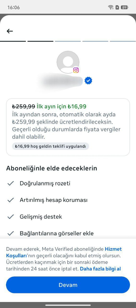 • Meta Verified için alacak kişi, abonelik satın aldıktan sonra hesapta (herhangi bir değişiklik) yapmalıdır. Meta Verified için alacak kişinin ilk işi abonelik almak olmalıdır.