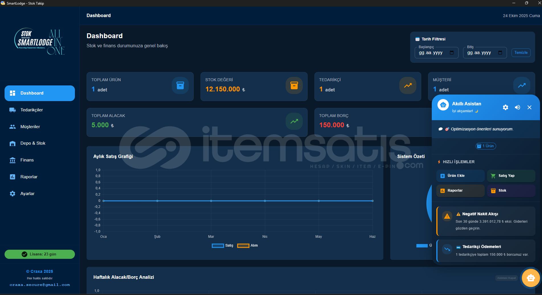 🚀 SmartLodge – Akıllı Stok & Finans Yönetim Sistemiİşletmeler için verimlilik artık bir tercih değil, bir zorunluluk. Stoklarınızı, finansal süreçlerinizi, müşteri ve tedarikçi ilişkilerinizi tek bir sistemde, kolayca yönetebildiğinizi düşünün… İşte tam bu noktada SmartLodge devreye giriyor.🔹 Neden SmartLodge? SmartLodge, tamame...