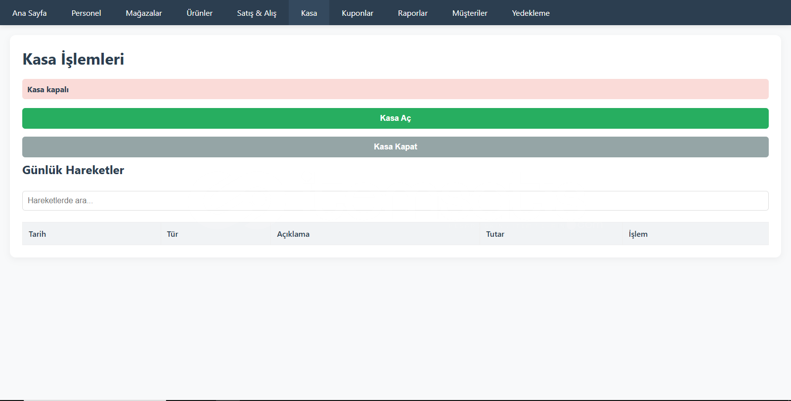• Kasa kapalı uyarısı: Kasa açılmadan satış yapılamaz — sistem sizi yönlendirir.