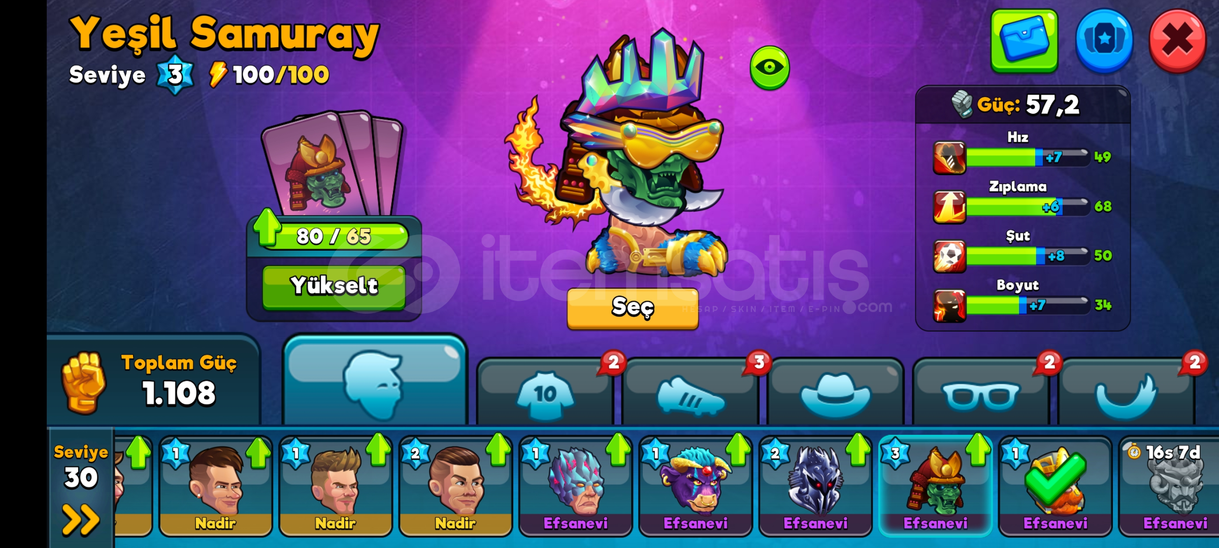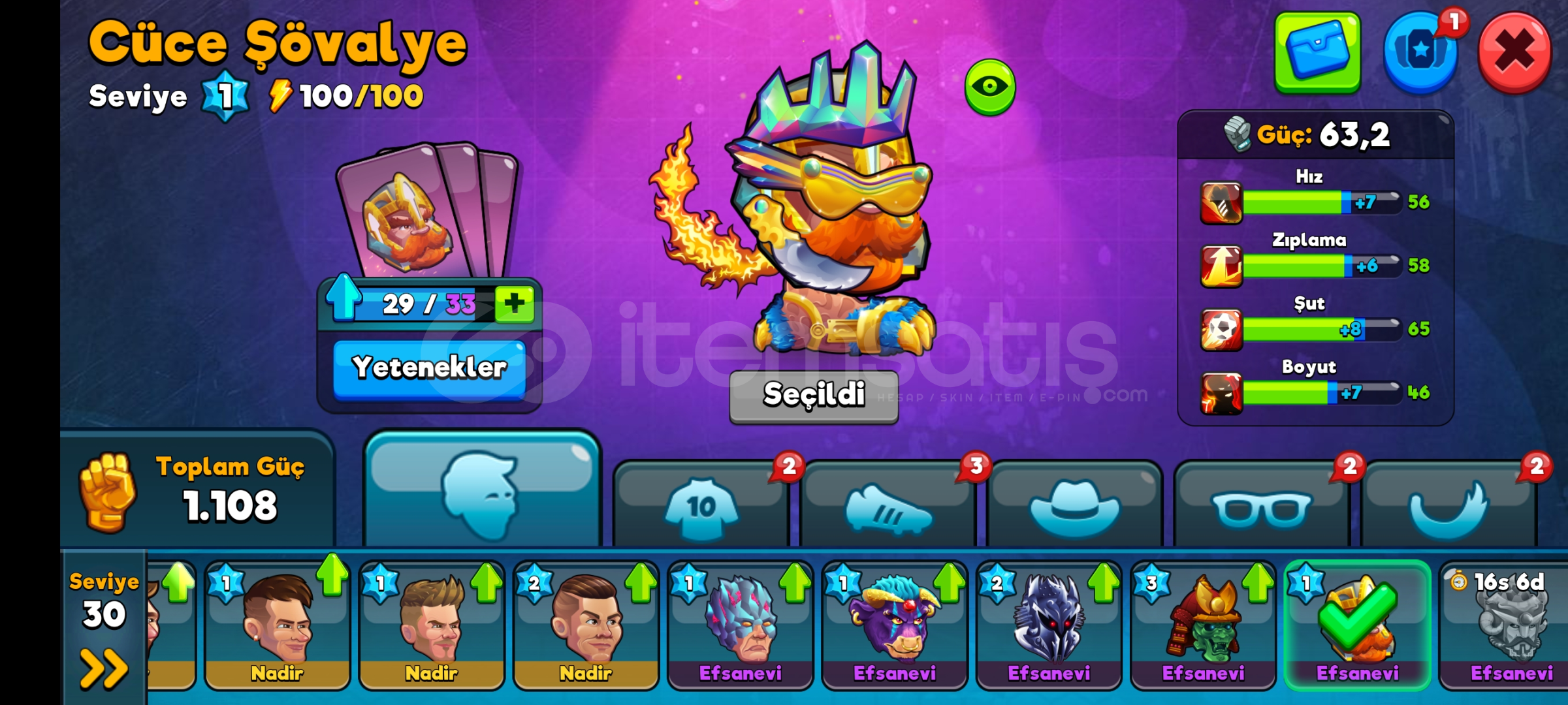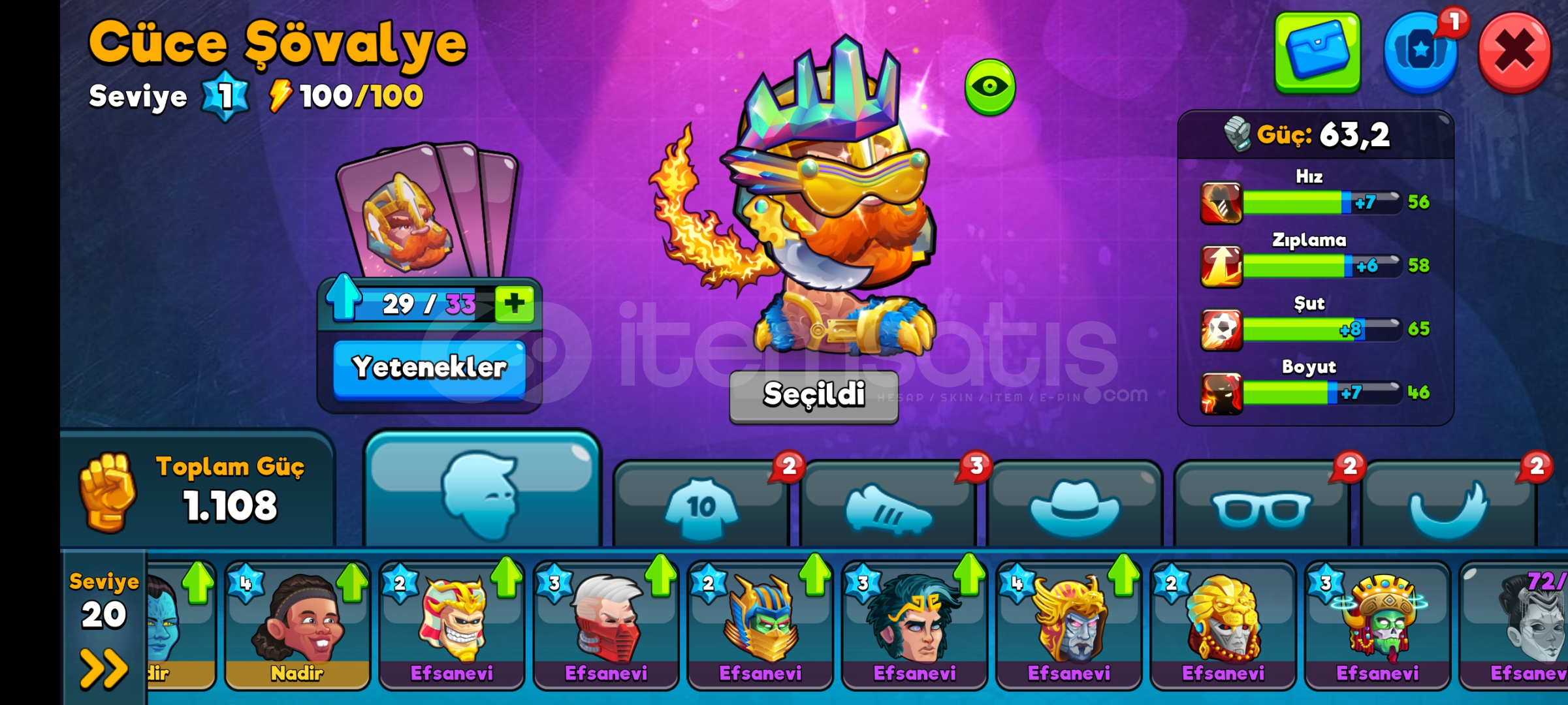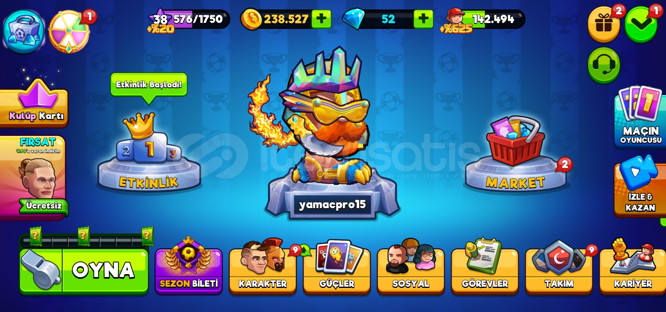 Karakter gücü şimdi 63,2 Şampiyonlar Ligi 3'tür. 140 bin taraftarı bulunmakta. OYUN İÇİ PARA: 238.527 Altın ve 52 Elmas var. Hesapta kilidi açılmış ve kartları bolca yükseltilmiş birden fazla Efsanevi Karakter bulunmaktadır.Hesap başlangıç için en ucuz hesaplardan biridir. Daha önceden para yatırılmış ve reklam yoktur.
