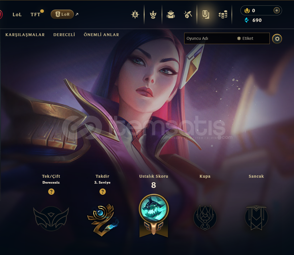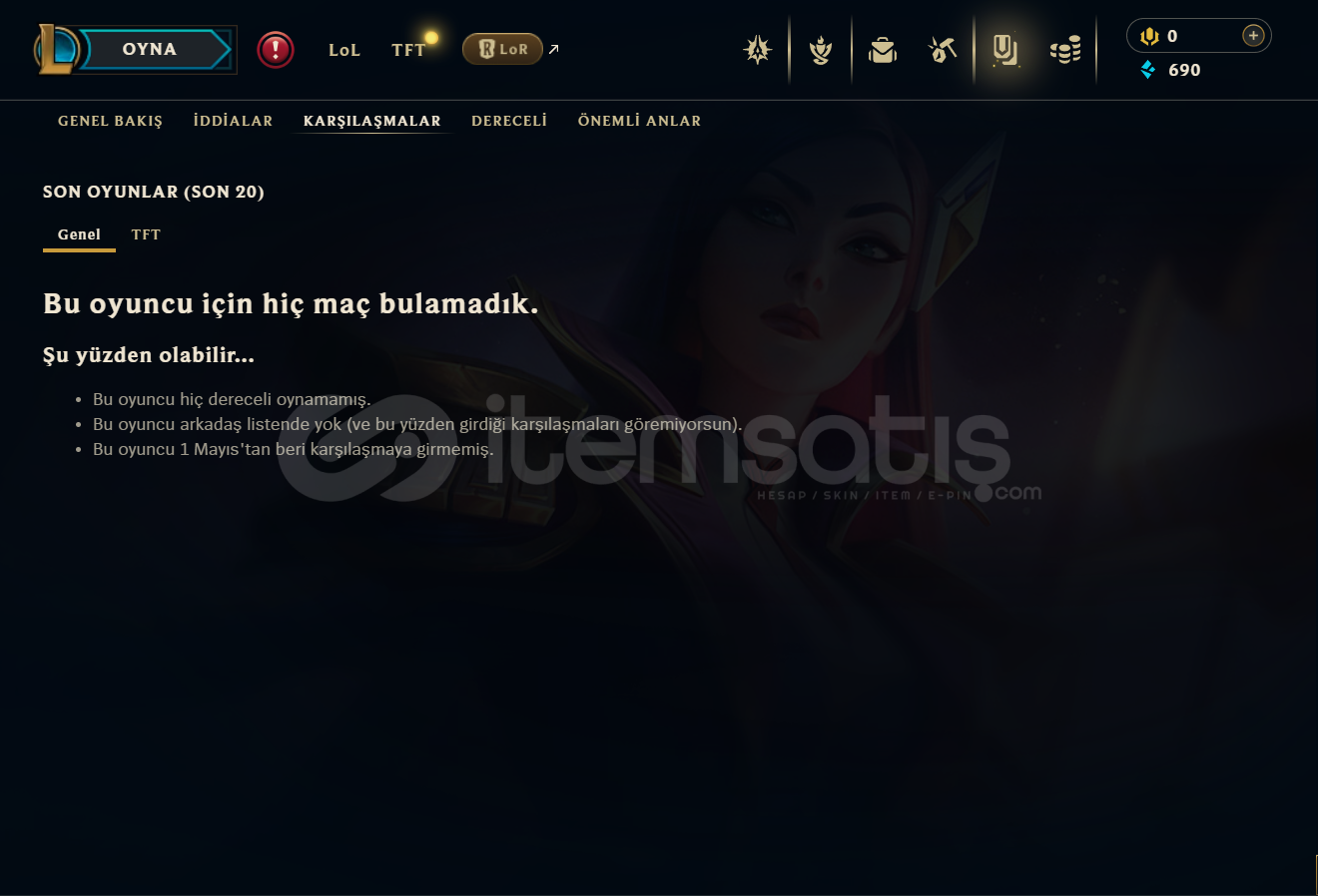 Hesap 2021 kurulum maç geçmişi olmayan eski hesaptır ban yemez . Hesap sizin mailinize kaydedilecek . Hesap 59 Level ve Unranked . Hiçbir ban yok . Kaliteli kostümler ve isim değiştirme hakkı mevcut . 7/24 sorunsuz teslimat . Alana hayırlı olsun .
