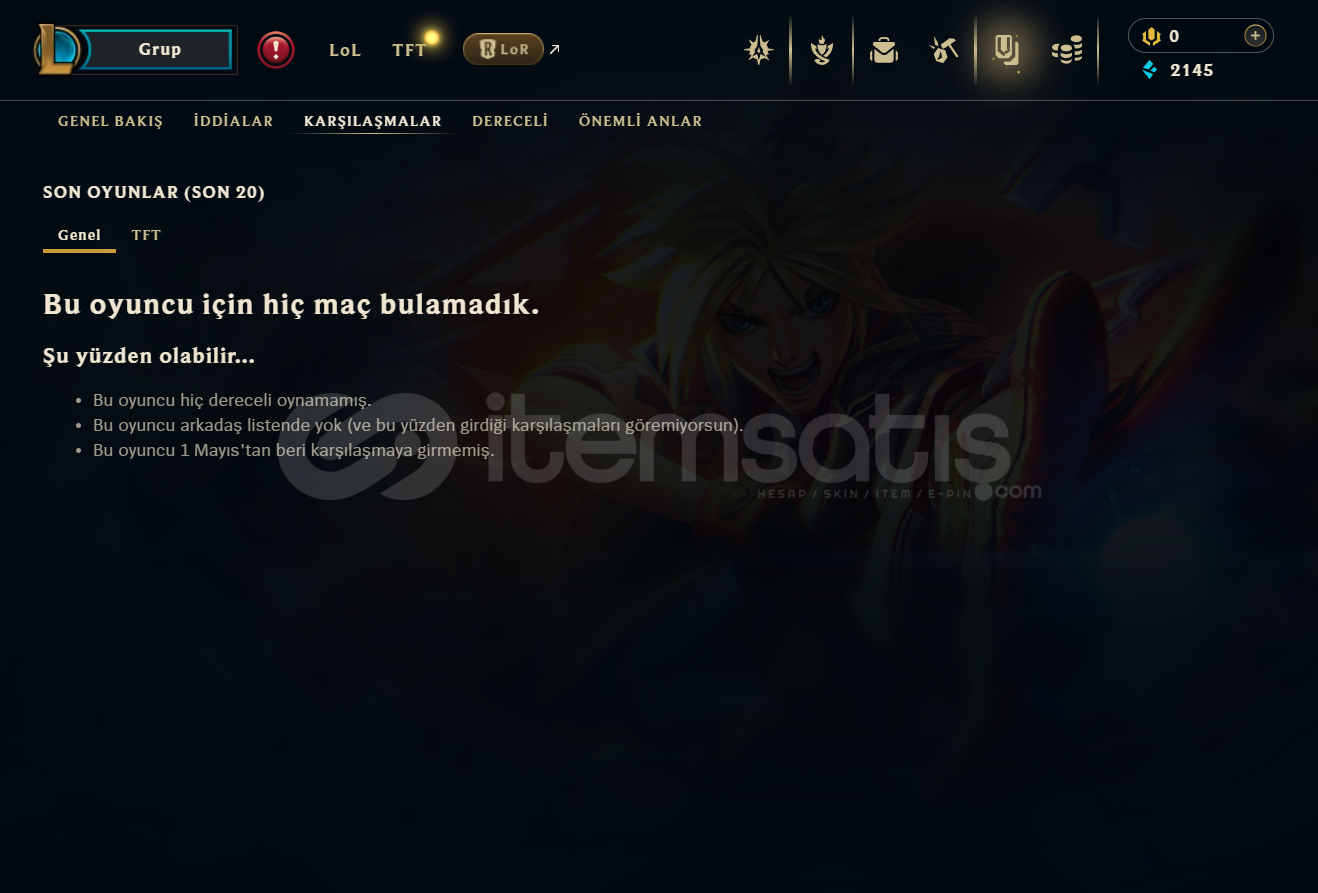 Hesap 2021 kurulum maç geçmişi olmayan eski hesaptır ban yemez . Hesap sizin mailinize kaydedilecek . Hesap 46 Level ve Unranked . Hiçbir ban yok . Kaliteli kostümler ve isim değiştirme hakkı mevcut . 7/24 sorunsuz teslimat . Alana hayırlı olsun .