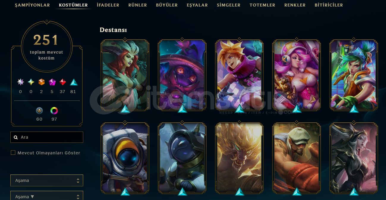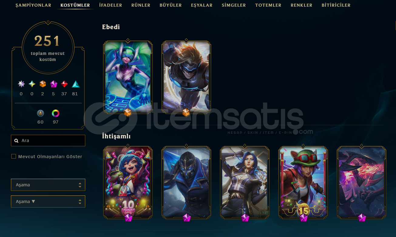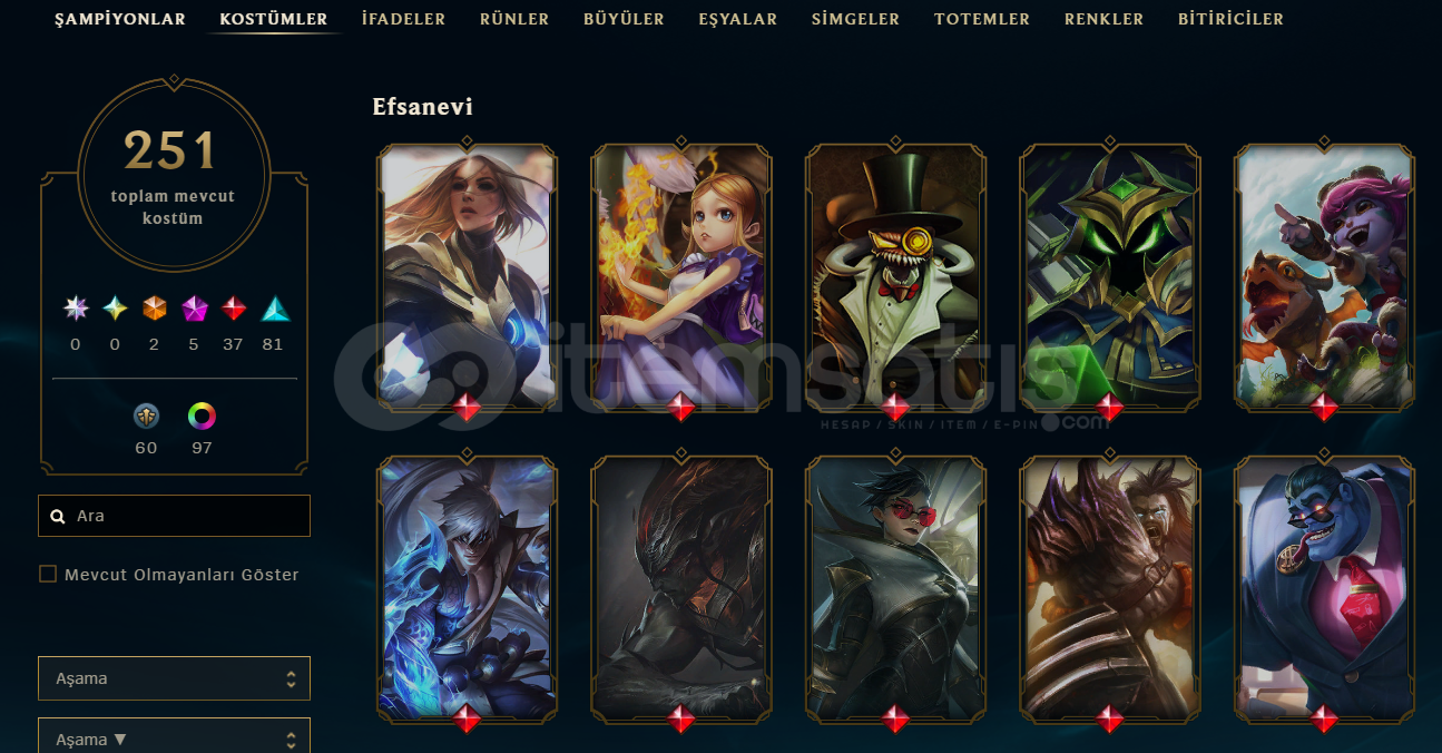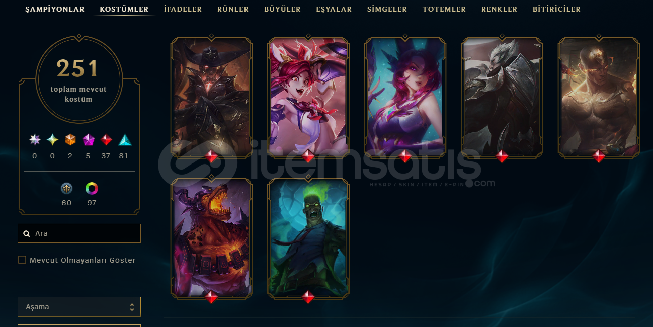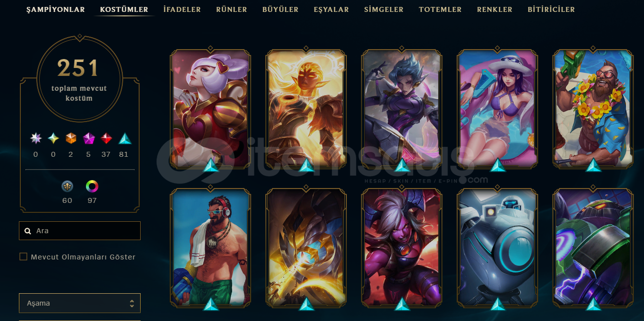 League of Legends hesap bilgileri;2 ebedi köstüm vardır5 ihtişamlı köstüm vardır37 efsanevi köstüm vardır81 destansı köstüm vardır60 hatıra köstümü vardır273 ifade vardır401 simge vardır40 totem vardır102 köstüm rengi vardırtüm karakterler vardır208k mavi öz vardırhesap tek çift rankı bronzdurhesap esnek rankı yoktur unrankeddı...
