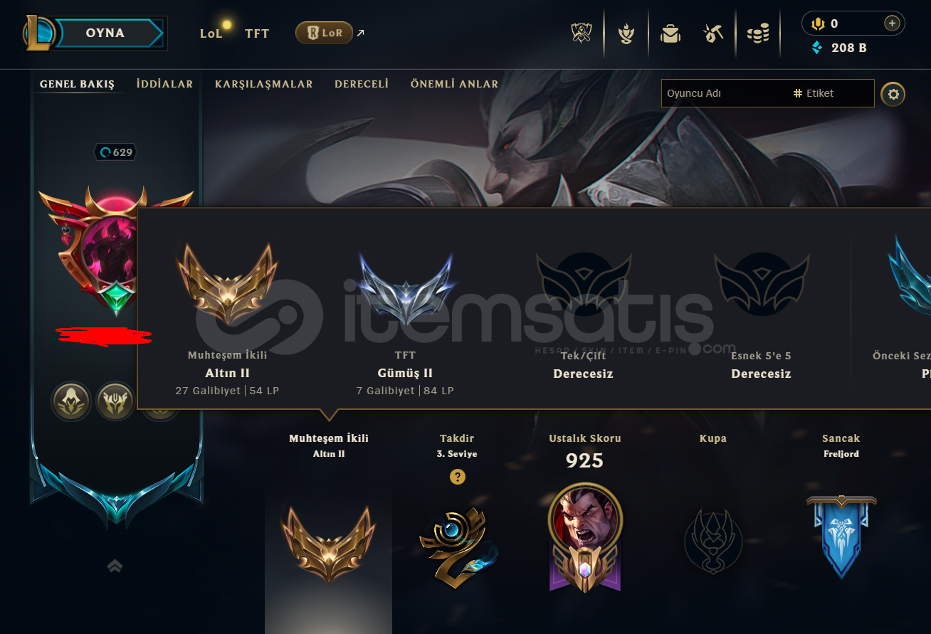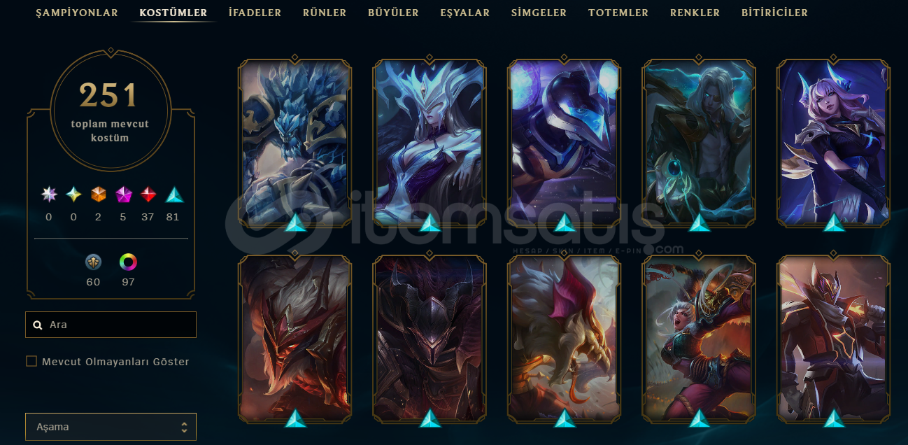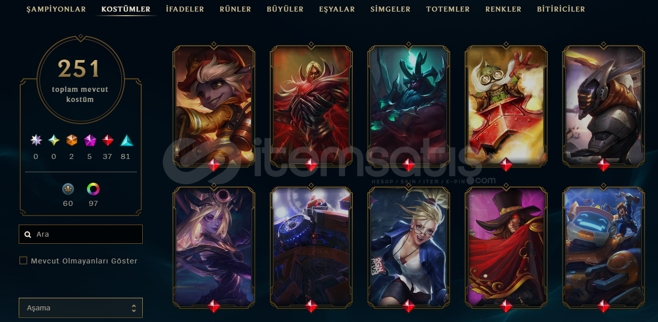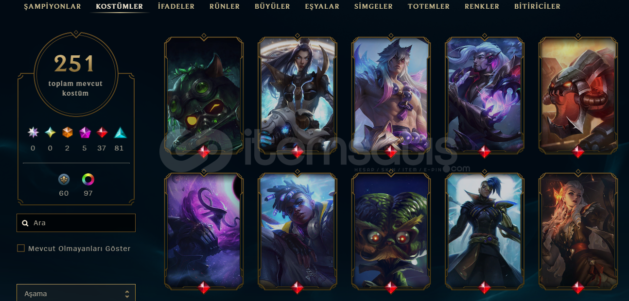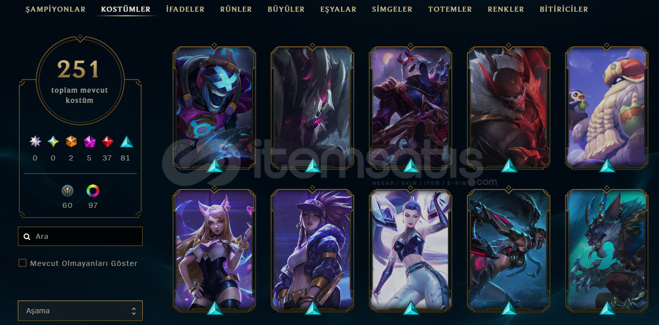 League of Legends hesap bilgileri;2 ebedi köstüm vardır5 ihtişamlı köstüm vardır37 efsanevi köstüm vardır81 destansı köstüm vardır60 hatıra köstümü vardır273 ifade vardır401 simge vardır40 totem vardır102 köstüm rengi vardırtüm karakterler vardır208k mavi öz vardırhesap tek çift rankı bronzdurhesap esnek rankı yoktur unrankeddı...