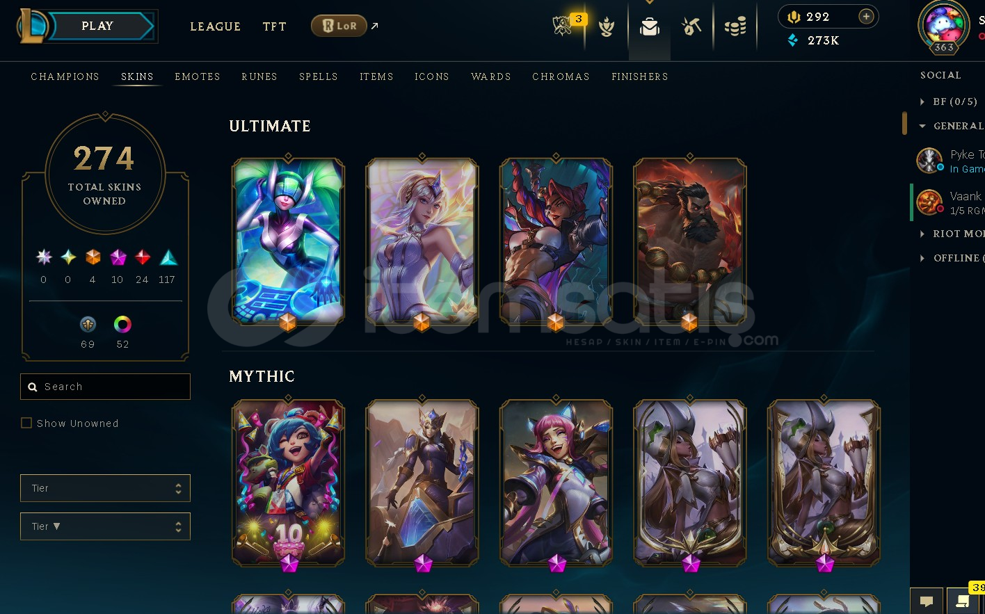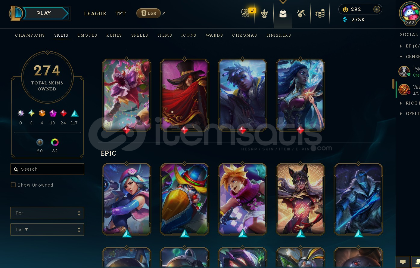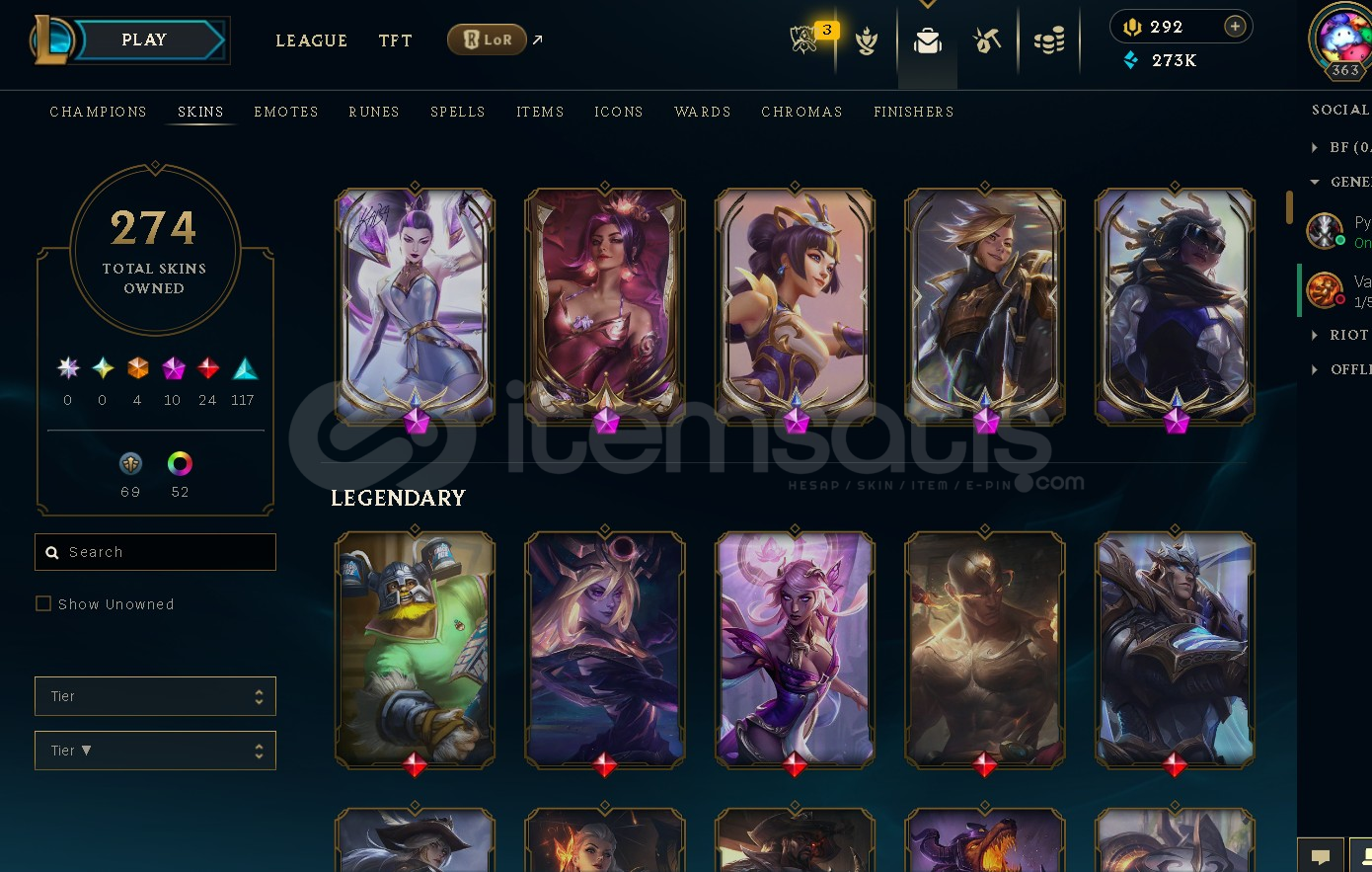 274 kostüm mevcut(4 ebedi,10 ihtişamlı,24 efsanevi,117 destansı)