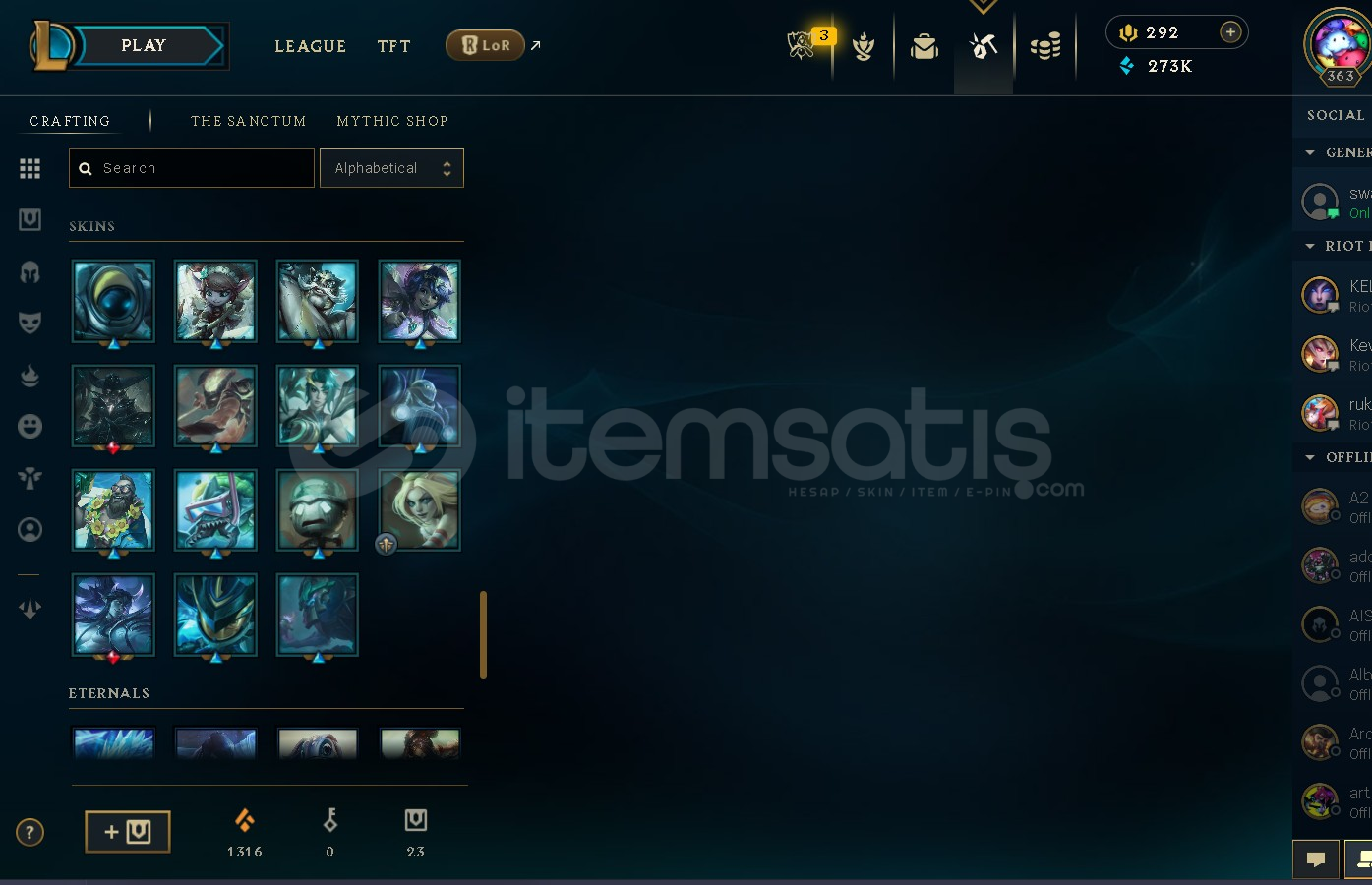 mail ve şifre değiştirilebilir.ganimet çok doludur şampiyonları parçalarsanız mavi öz 300kyı aşar,15 adet kostüm kristali ve 23 adette ekstra sandık mevcut.274 kostüm mevcut(4 ebedi,10 ihtişamlı,24 efsanevi,117 destansı)sunucu euwhiçbir ban mevcut değil.rank unranked(ortalama plat eloyla eşleşir)105 ihtişamlı öz mevcut.