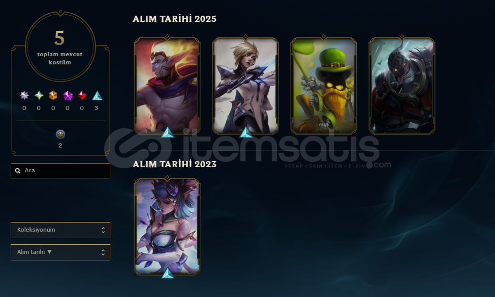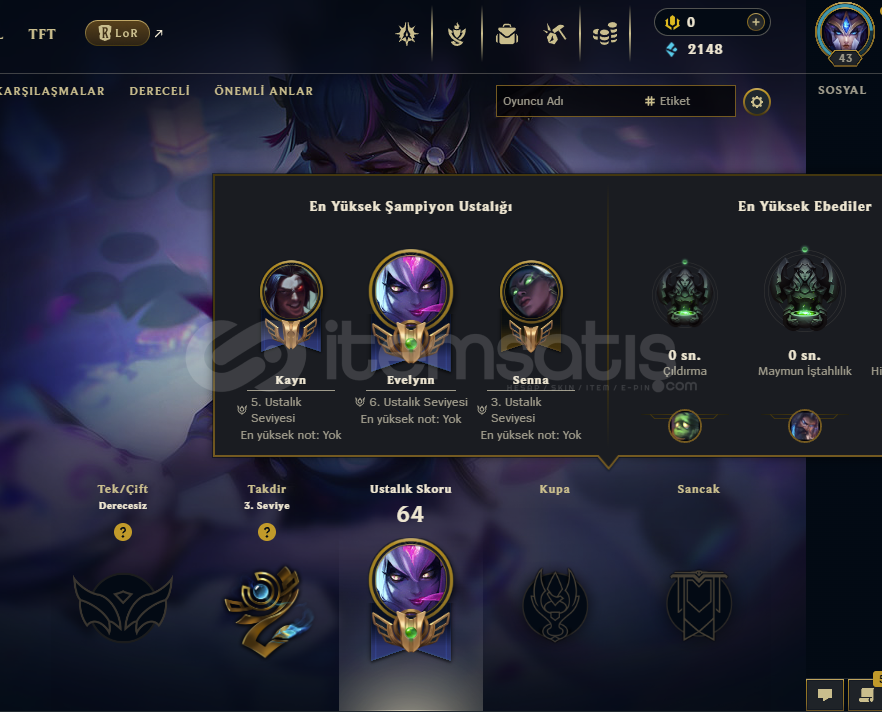 5 Kostümlü Ranked Hazır 43 Level EUW HesapHesabın op.gg linki: https://op.gg/tr/lol/summoners/EUW/West%20Enesci-EUW