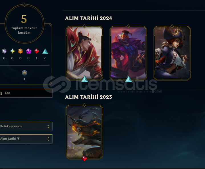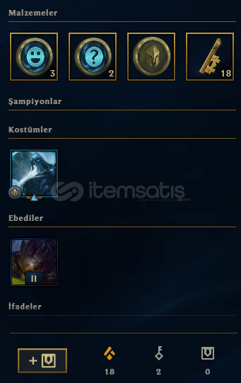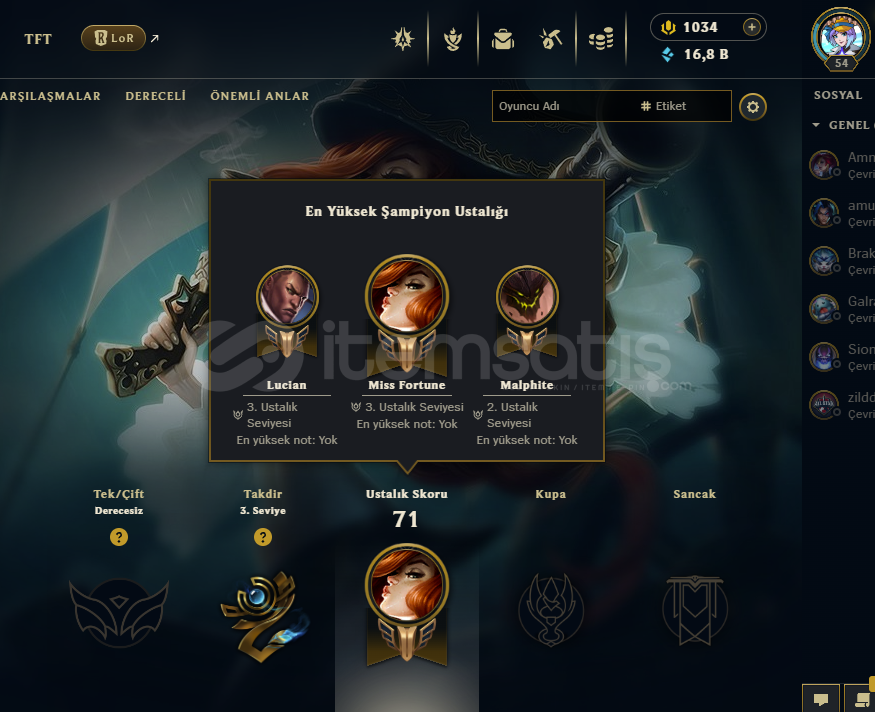 5 Kostümlü 54 Level EUW HesapHesapta 1034RP ve 16,8B Mavi Öz vardırHesap Ranked girebilmektedirHesabın op.gg linki: https://op.gg/tr/lol/summoners/EUW/NeedForTribe-28511