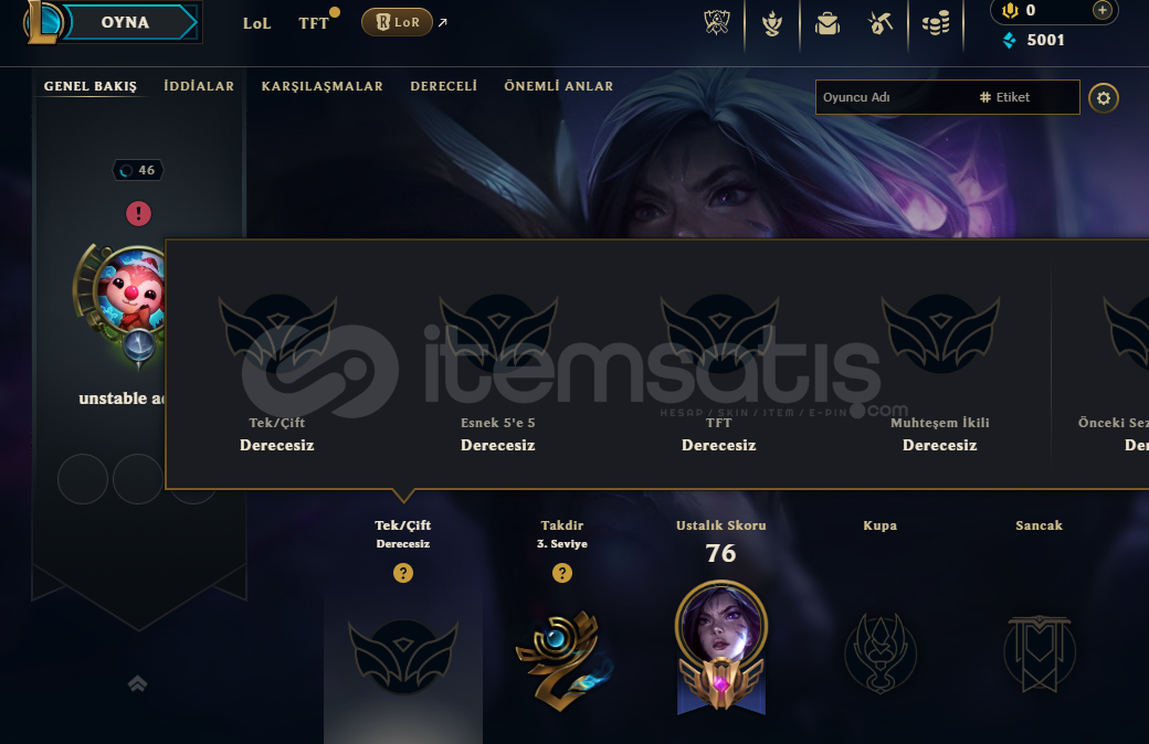 Geçen sezon gold bitirmiştir. Şu anda unranked.Hesabı satın aldığınızda kullanici adı şifre size otomatik olarak iletilecektir.Dereceli girmek için 5 derecesiz atmak zorundadır.