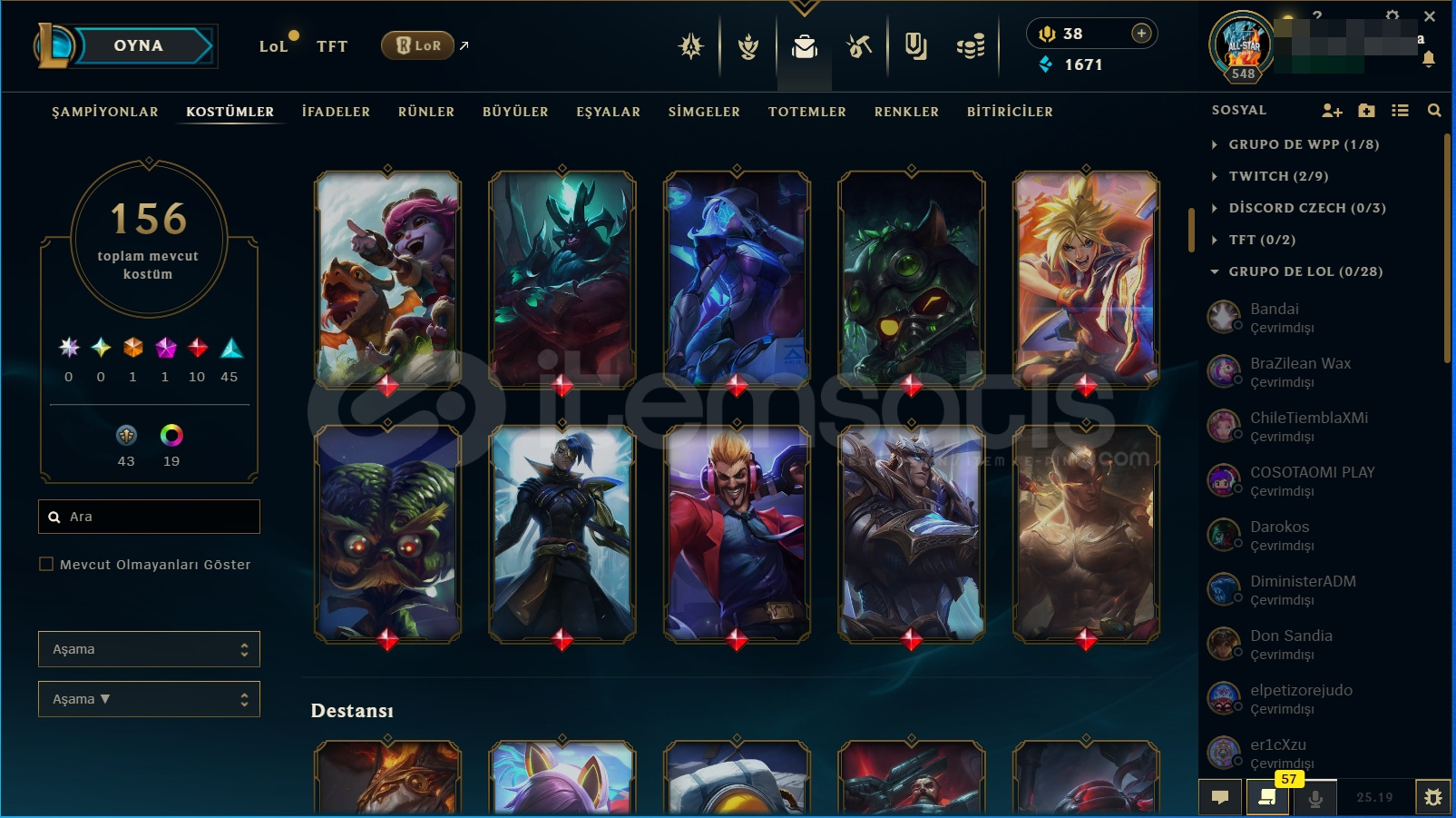 Gerçek bir Brand OTP oyuncusuna özel, 1.1 milyon ustalık puanlı, 170 şampiyon ve 156 kostümlü koleksiyon hesabı.
