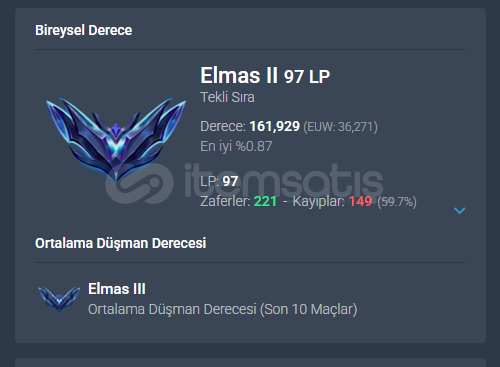 Hesap Elmas 2 97 LP dir.Başyargıç Kayle Skini vardır hesap Kayle mainHesabın WR 60 dır+22 -18 almaktadırHesap sezon 1 de açıldı.