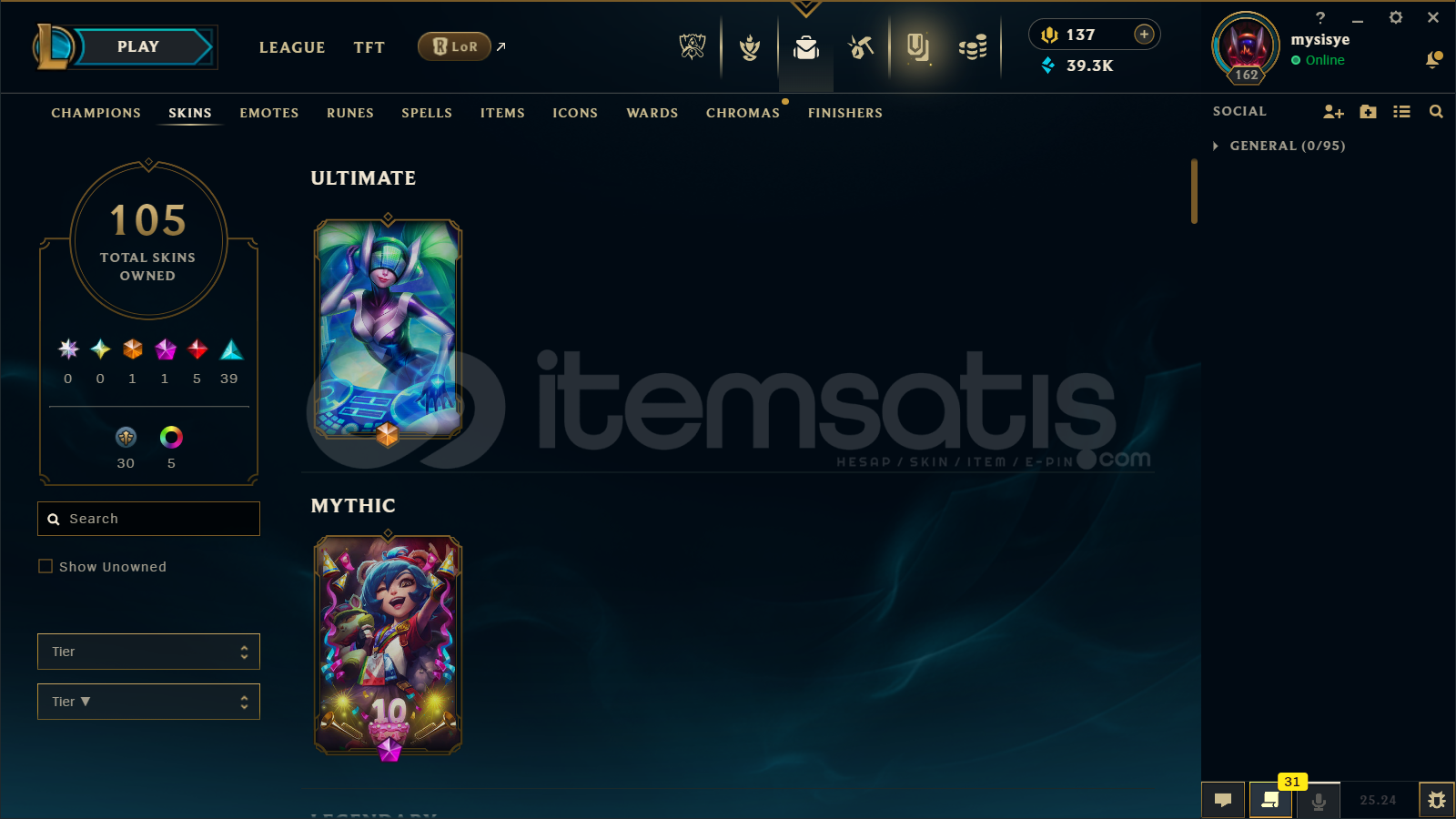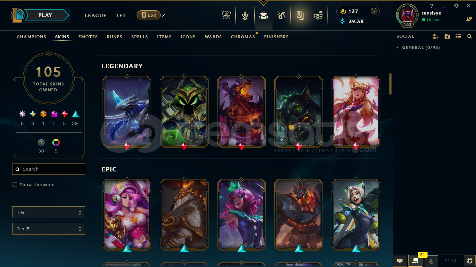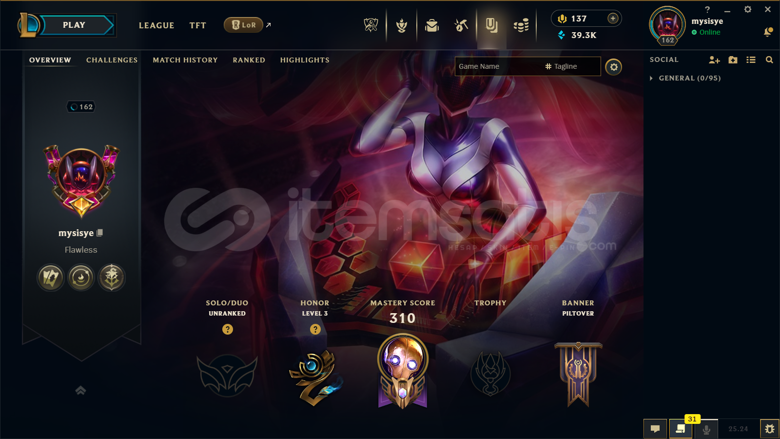 🔷 League of Legends Bilgileri🔹 Sunucu: EUW🔹 Level: 162🔹 Sıralama:• Tek/Çift: Unranked• Esnek 5v5: Unranked🔹 Mavi Öz: 39300🔹 Şampiyon Sayısı : 160🔹 Kostüm Sayısı: 105📊 OP.GG Profili : https://op.gg/tr/lol/summoners/euw/mysisye-EUW✅ Hesaplarımın Tamamen ArkasındayımPiyasadaki bir...