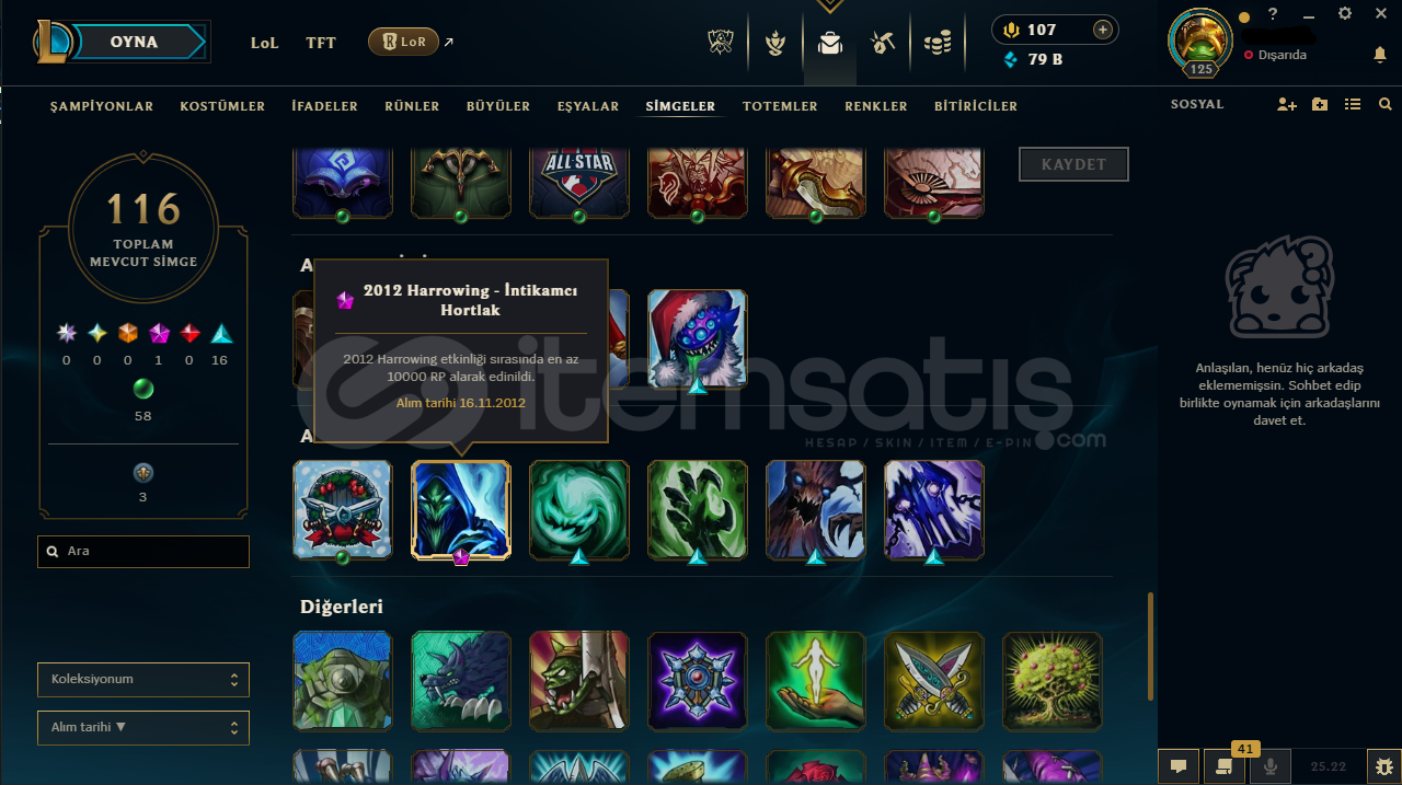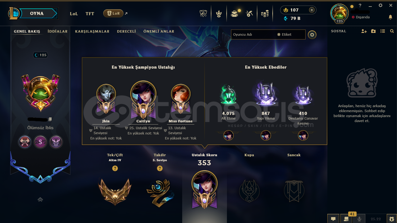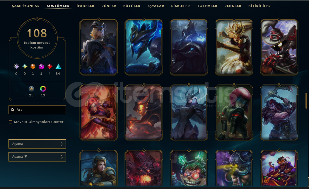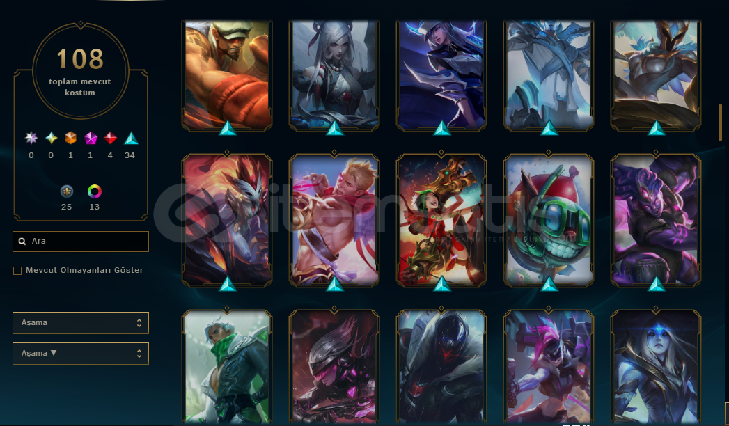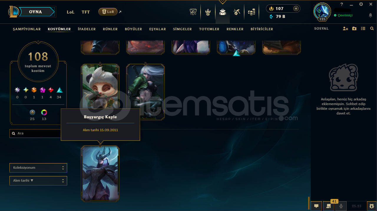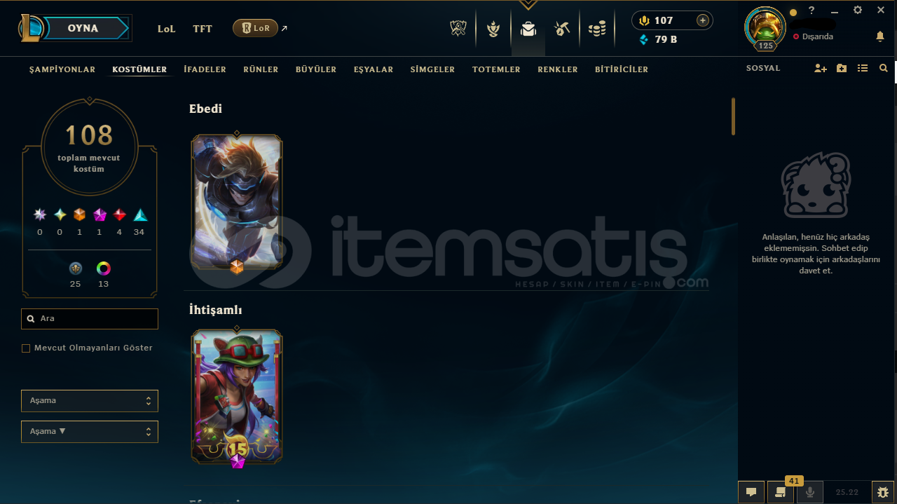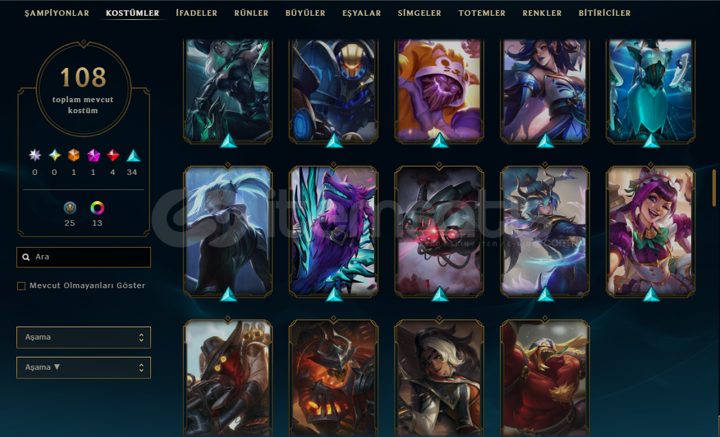 Hesabın E-Posta'sı ve Tüm bilgileri değiştirilebilir.Teslimat manueldir, 6 saat içerisinde teslim edilir.Dereceli Direkt Girilebilir.79K Mavi Öz & 3522 Turuncu Öz Bulunmaktadır.Hesabınızı satın aldıktan sonra sizden başka kimsenin erişimi olmaz.125 Level - GOLD IV(EUW) Hesaptır.108 Kostüm ve 157 Şampiyon bulunmaktadır.------------------------------------HESAP KOLEKSİYONLUK OLUP A&...