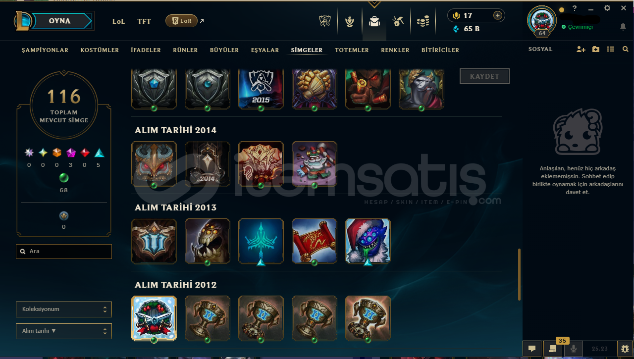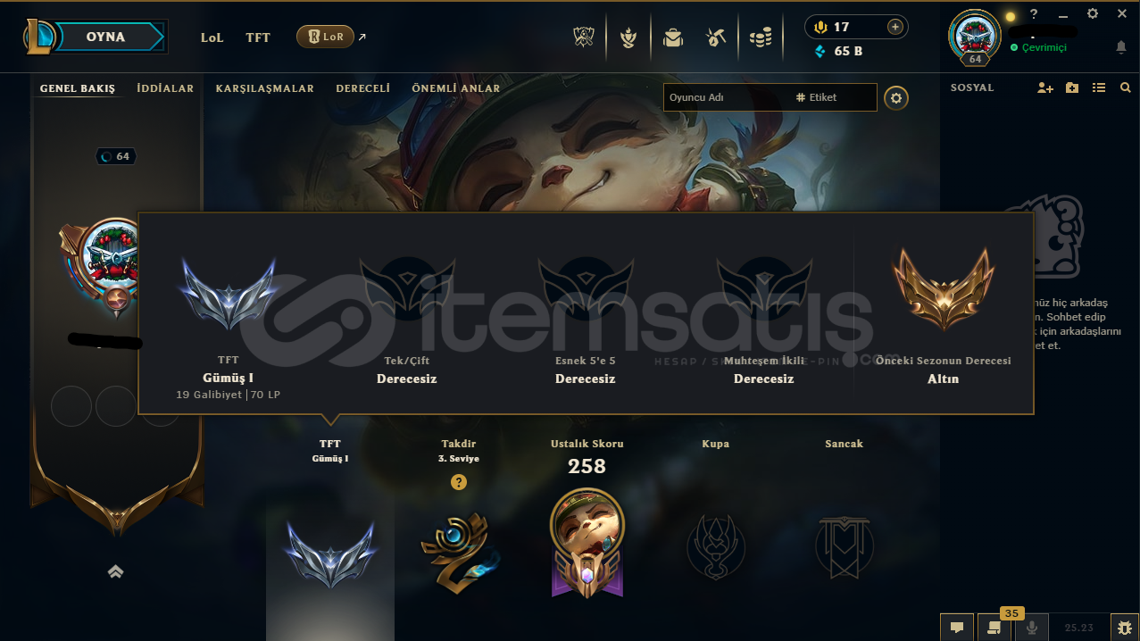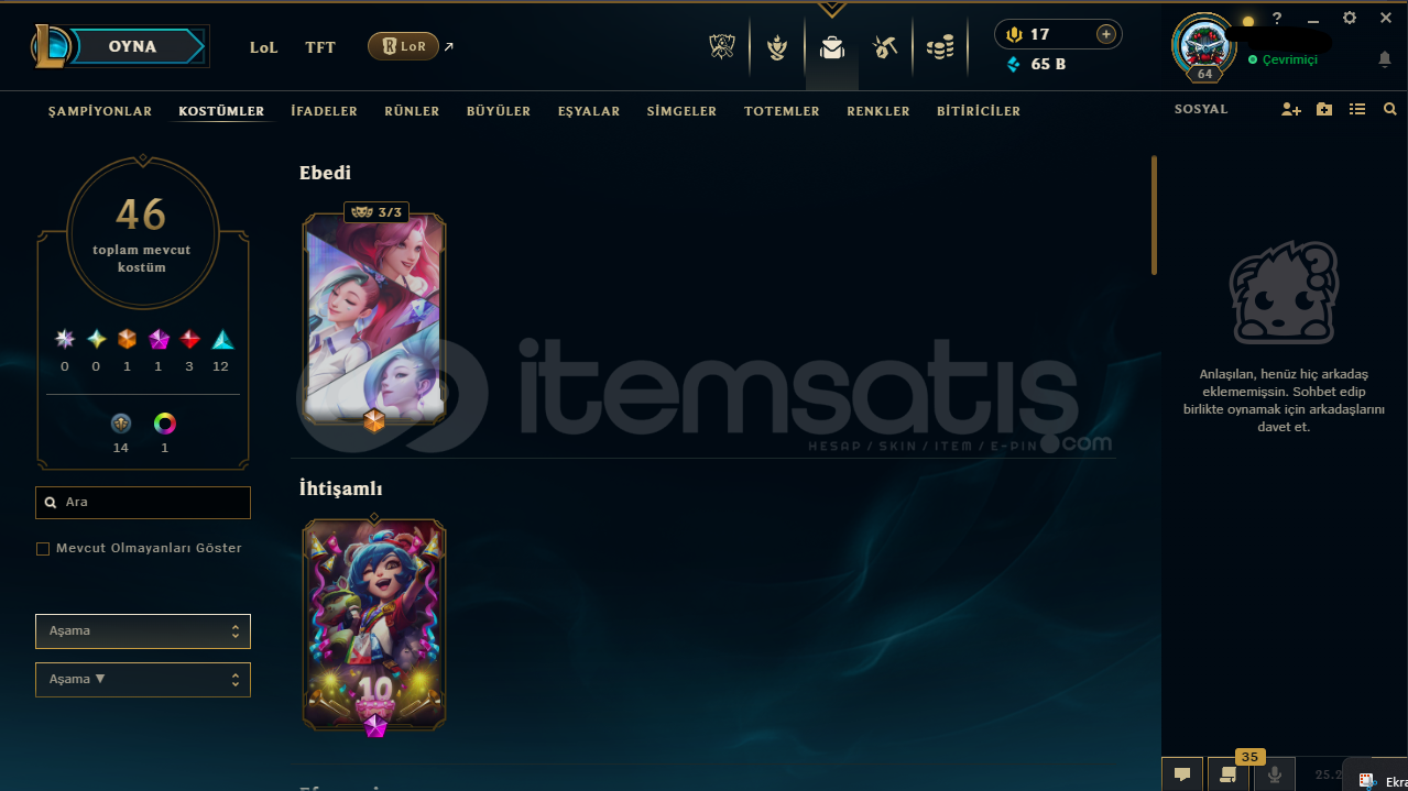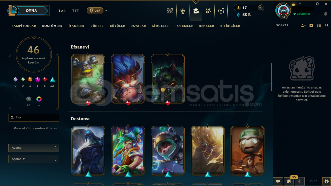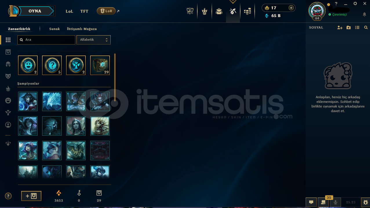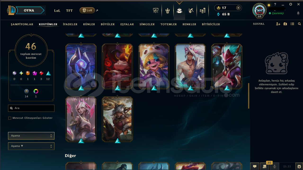 Hesabın E-Posta'sı ve Tüm bilgileri değiştirilebilir.Teslimatlar Otomatik Yapılmaktadır, 7/24 satın alabilirsiniz. Hemen Eposta - Şifre - Mail Teslim edilmektedir.Dereceli Direkt Girilebilir.65 K Mavi Öz & 3653 Turuncu Öz + 29 Sandık Bulunmaktadır.Hesabınızı satın aldıktan sonra sizden başka kimsenin erişimi olmaz..64 Level + UNRANKED (EUW) Hesaptır.46 Kostüm ve 109 Ş...