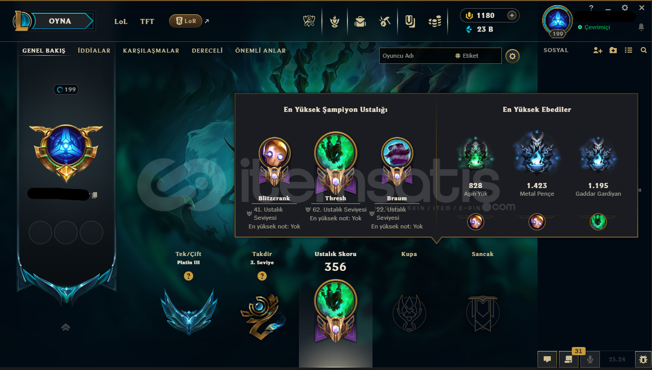 Hesabın E-Posta'sı ve Tüm bilgileri değiştirilebilir.Teslimatlar Otomatik Yapılmaktadır, 7/24 satın alır almaz tüm hesap bilgilerine ulaşabilirsiniz...Dereceli Direkt Girilebilir---------------LEAGUE OF LEGENDS---------------23K Mavi Öz & 2583 Turuncu Öz + 54 Anahtar Bulunmaktadır.Hesabınızı satın aldıktan sonra sizden başka kimsenin erişimi olmaz.199 Level - PLAT III (EUW) Hes...