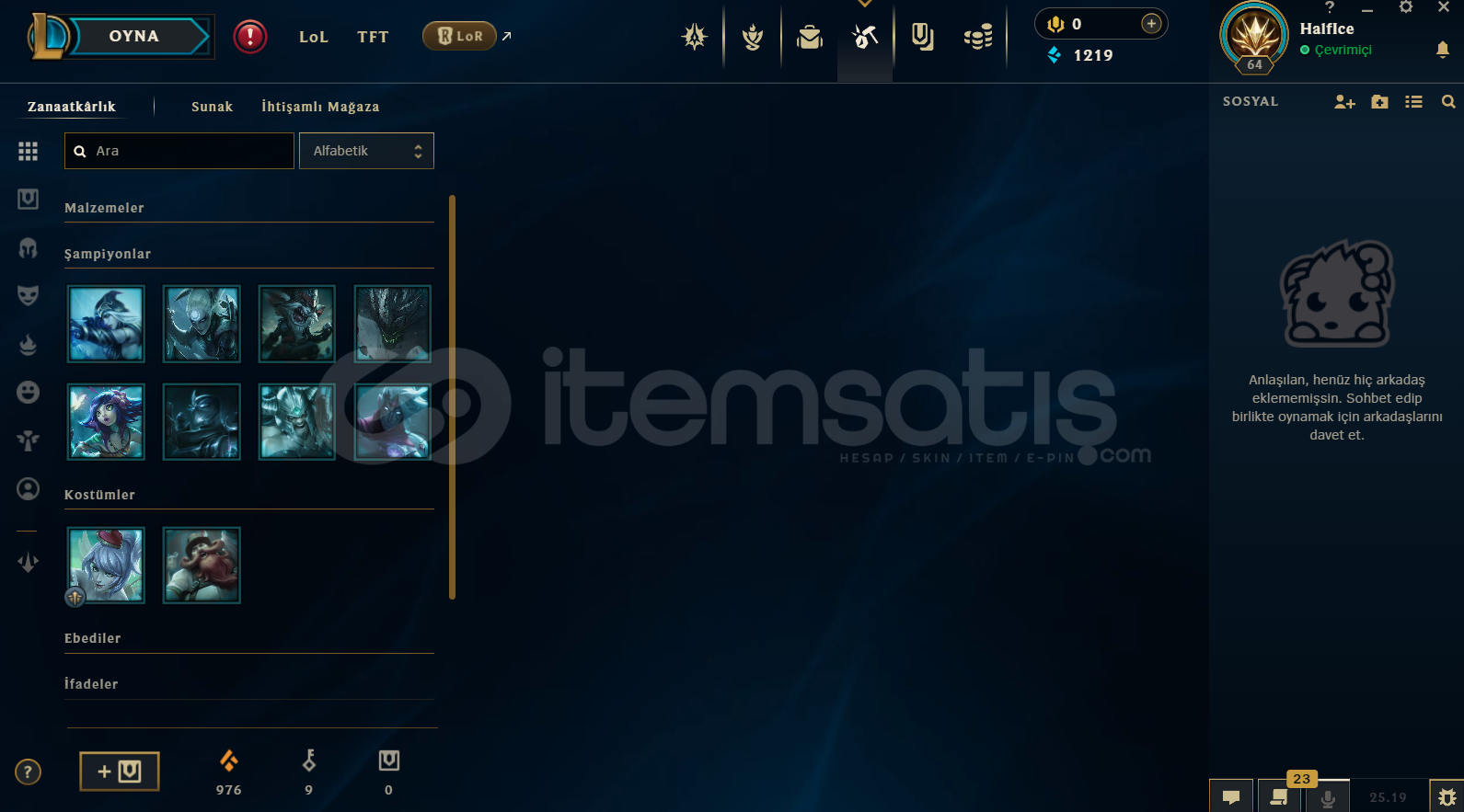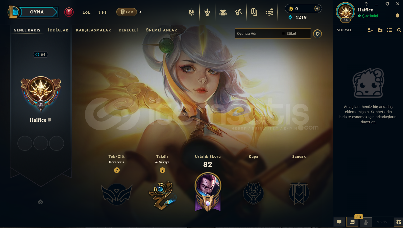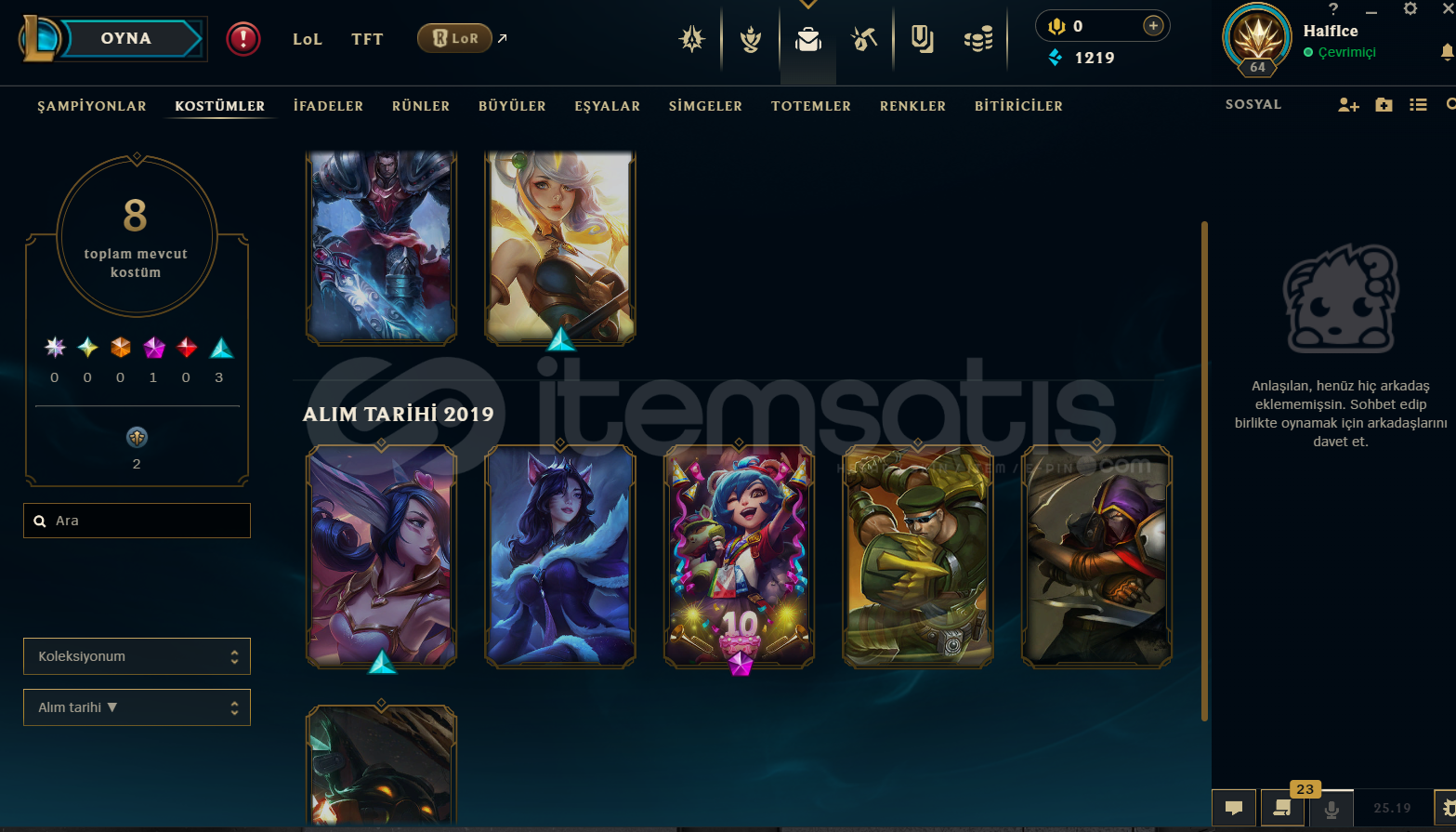 hesapta hiç dereceli girilmedi unranked64 level hesapkostümler resimdeki gibi 8 tane + envanterde 2 tane varşampiyon sayısı 36 ve envanterde şampiyon kristalleri varhesabın ilk sahibi benimherhangi bir ban veya ceza durumu yoksana özel mağazadaki kartları açmadım duruyo hepsietkinlik kartı 1 level hiç yapılmadıserver EU WESTsorunuz olursa mesaj yazabilirsiniz