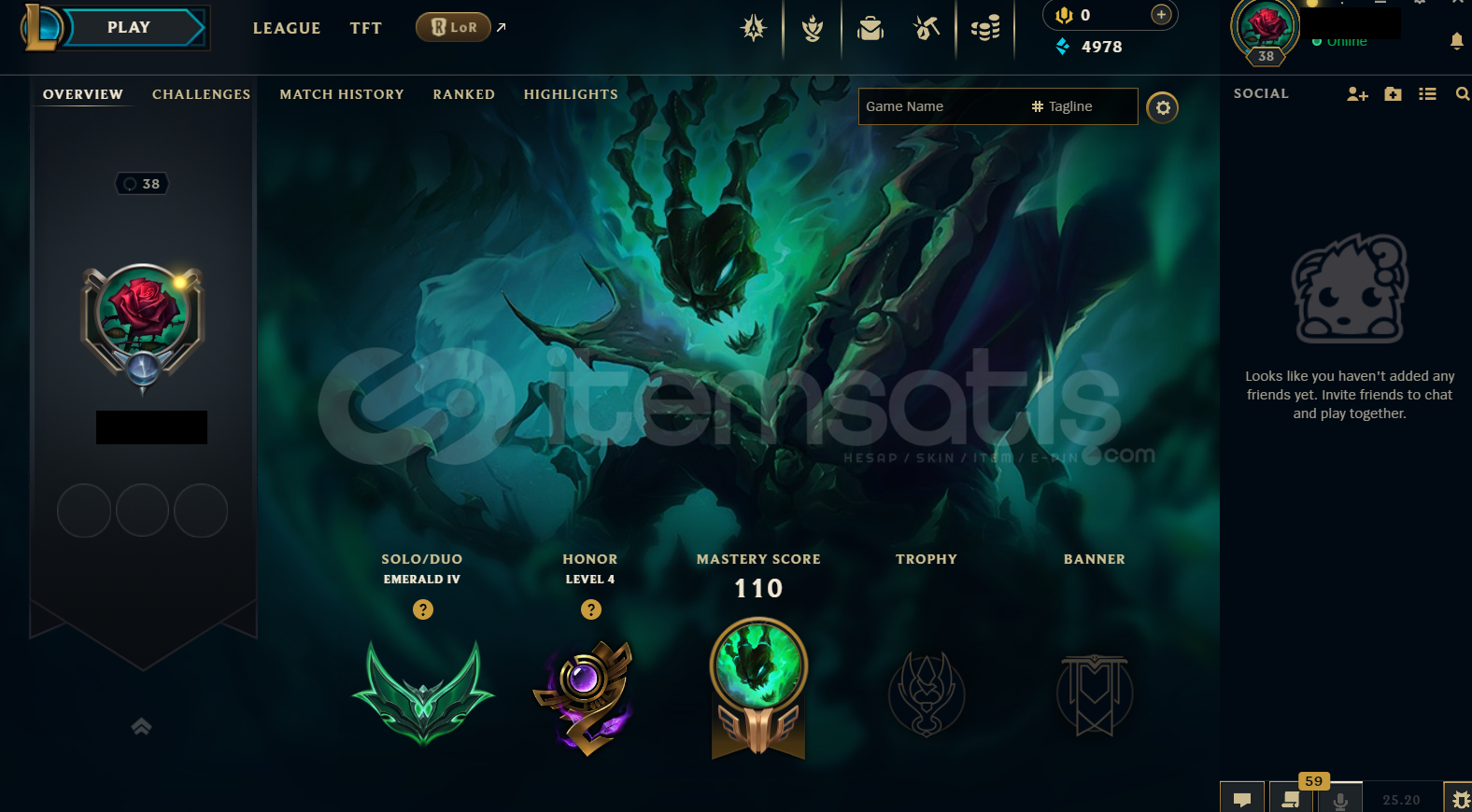 Hesap EUW Tek/Çift Zümrüt 4 - 31 Win 18 Lose 64 Winrate - Esnek Plat 1 - 40 Lp - 2 Win 0 Lose 100 Winrate EUW LoL Hesabıdır. Geçen Sezonu Zümrüt Bitirmiştir.