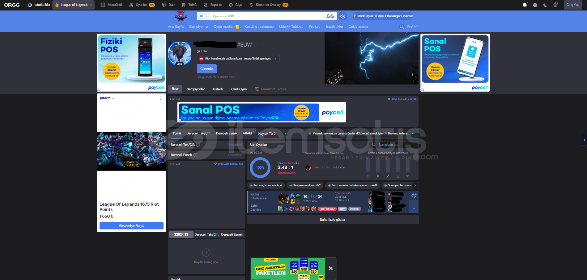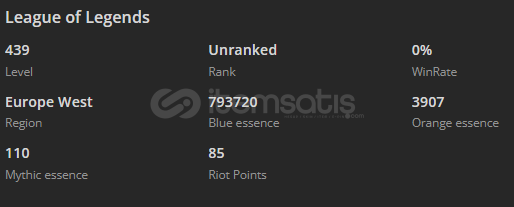 Hesabı satın almadan önce yazınız lütfen.-------------------Hesabın E-Posta'sı ve Tüm bilgileri değiştirilebilir.Teslimatlar Otomatik Yapılmaktadır, 7/24 satın alır almaz tüm hesap bilgilerine ulaşabilirsiniz...Dereceli Direkt Girilebilir.Hesabınızı satın aldıktan sonra sizden başka kimsenin erişimi olmaz.439 Level - Unranked (EUW) Hesaptır.75 Kostüm ve 101 Şampi...