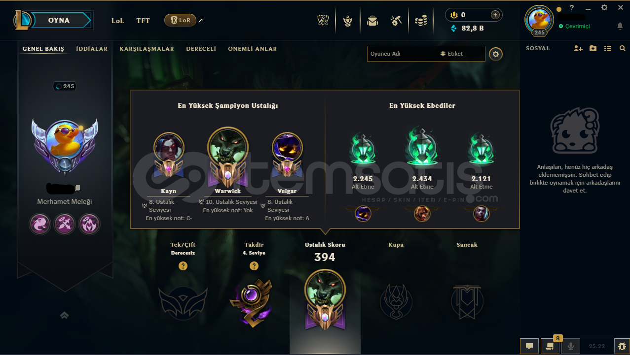 ⭐EUW+83SKIN+245LVL+111CHAR+UNRANKED+82K ÖZ⭐