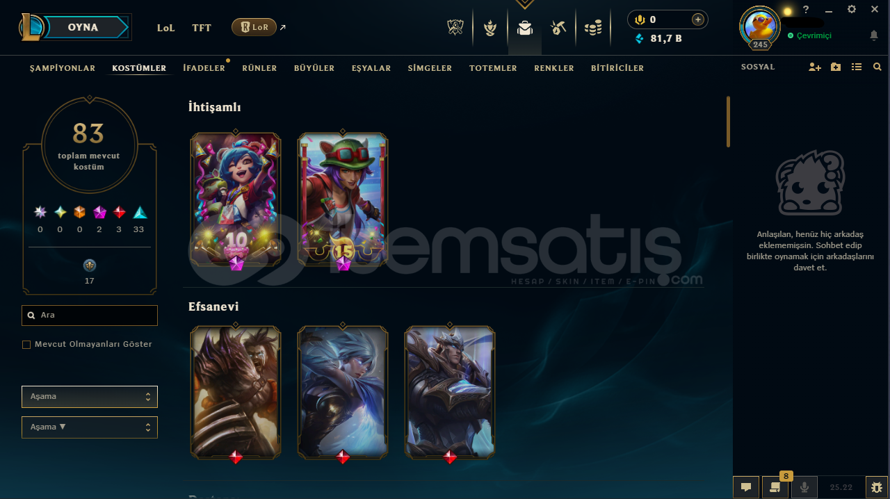 Hesabın E-Posta'sı ve Tüm bilgileri değiştirilebilir.Teslimatlar Otomatik Yapılmaktadır, 7/24 satın alır almaz tüm hesap bilgilerine ulaşabilirsiniz...Dereceli Direkt Girilebilir.81,7K Mavi Öz & 865 Turuncu Öz + 11 Sandık Bulunmaktadır.Hesabınızı satın aldıktan sonra sizden başka kimsenin erişimi olmaz.245 Level - Unranked (EUW) Hesaptır.83 Kostümve 111 Şamp...
