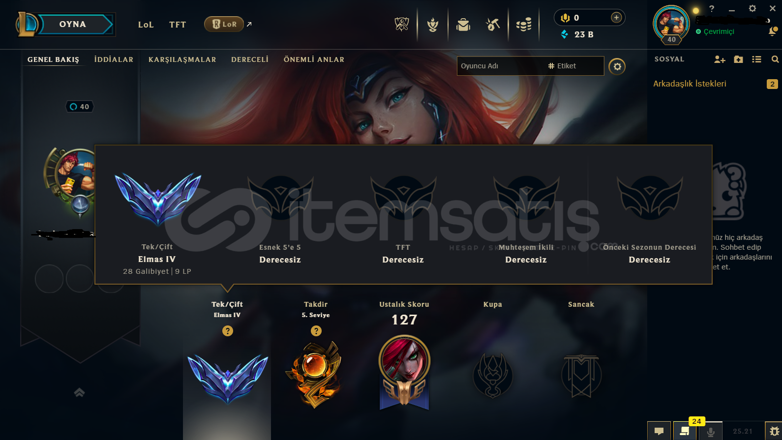 Hesap Mail Onaysızdır İlk Sahibi Siz Olursunuz.Wins: 28  Losses: 17 62 WinrateHesap Yüksek Puan Alır Az Puan Gider Kolayca lig Atlayabilirsiniz.Hesapta Ban yeme Riski Yoktur Yaklasık 1 Yıllık hesaptır.İsim Değiştirme Hakkı Mevcuttur Mainlemeye Uygun.Otomatik Teslimattır Online Olmamı Beklemeden Satın Alabilirsiniz.