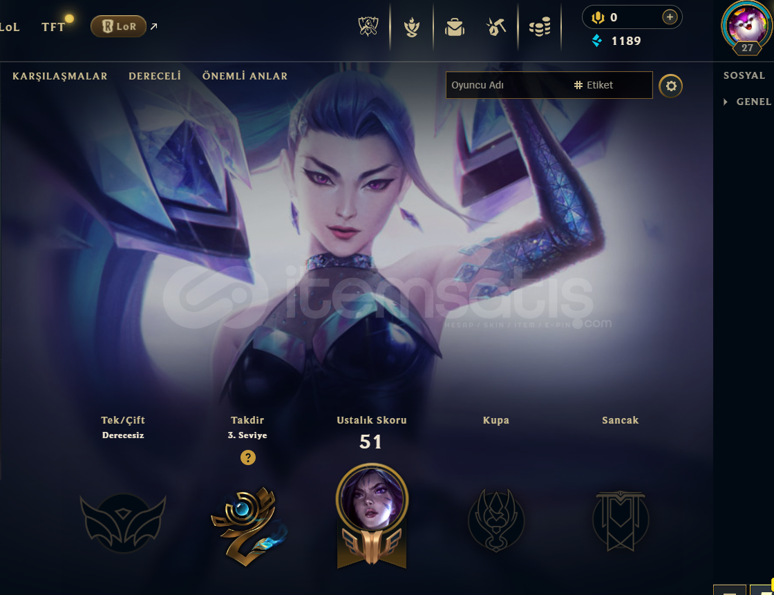 ESKİDEN KALAN HESAPTIR. #2021HERO : 18SKIN : 4MAVİ ÖZ: 1,1KLEVEL : 27-///// KOSTÜMLER - ŞAMPİYONLAR /////Ejder Terbiyecisi Tristana - K/DA ALL OUT Kai'Sa - Kabus Tryndamere - Savaş Kraliçesi Diana -Diana Dr. Mundo Irelia Samira Vladimir Fiddlesticks Fizz Kai'Sa Warwick Yorick Garen Gwen Tryndamere Jax Morgana Darius Riven-Hesabı Üzerinize Alırken Adım Adım Yardımcı Oluyoruz.Daha fazlası için mesaj atabi...