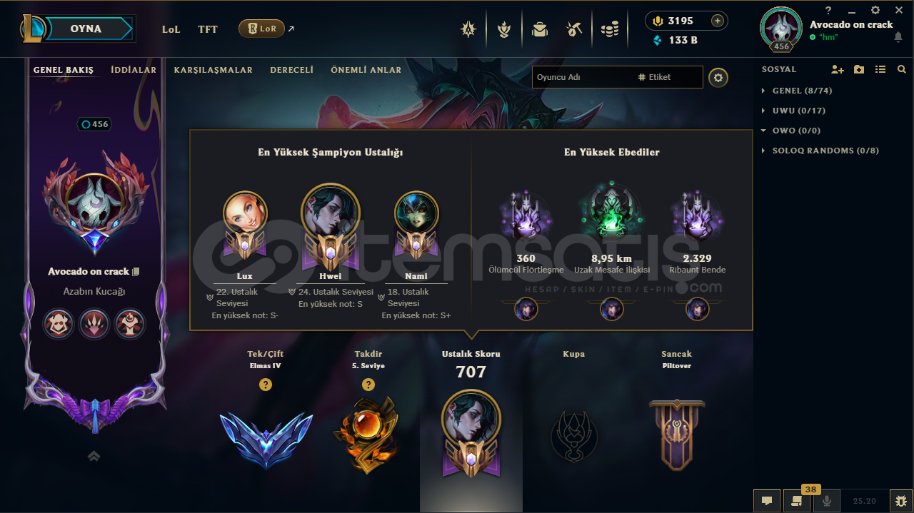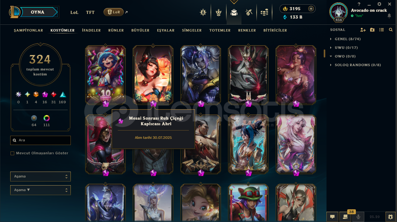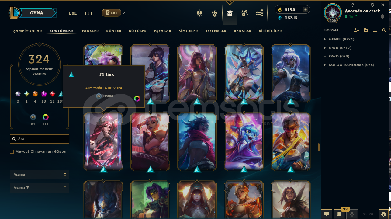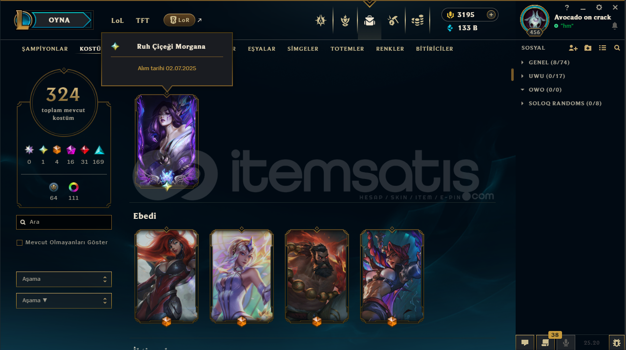 Eu serveristenirse tr geçebilir 2600 rp ye324 kostümruh çiçeği morgana3195 rp133 b özelmas 4takdir seviyesi 5hwei 24 lvllux 22 lvlnaim 18 lvltft chibi savaş akadademisi katarinahesapta herhangi bir ban yokturmail değişimi yapılıcaktırsatın alım sonrası hızlıca teslim ediyorum .
