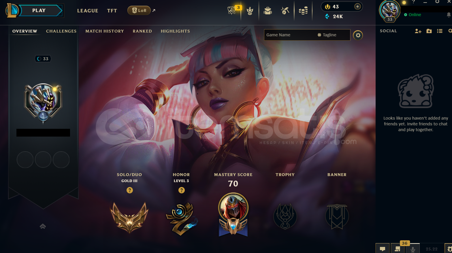 HESAP DETAYLARI:Hesap hiç ban yememiştir ve takdir seviyesi 3 dür.Hesap EUW Tek/Çift Gold 3 - 27 Lp EUW LoL Hesabıdır.İçerisinde 24035 Mavi Öz 4 Kostüm 27 Hero ve 3 Adet İade Hakkı Mevcuttur.HESAP HAKKINDA:Kendi mail adresinize kayıt edebilir, etkinleştirmeyi kaldırabilir ve şifresini değiştirebilirsiniz.Hesaplarımızda hiç bir sıkıntı çıkmamaktadır.Herh...
