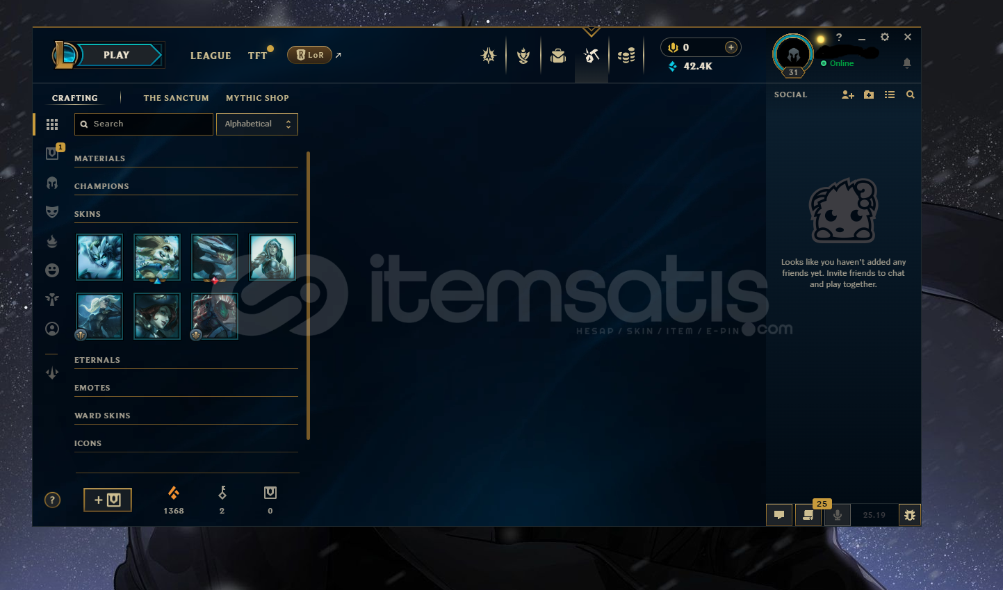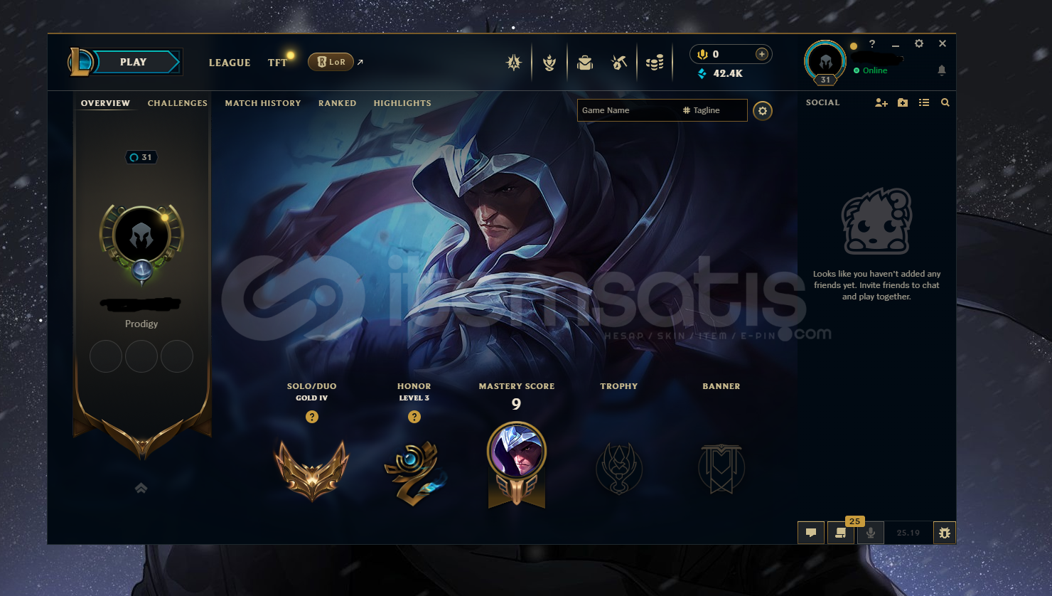 Sunucu: EUWE-mail: Onaylı DevredilecekHesap Seviyesi: 31Gold 4 0lp 83 Winrate20 Şampiyon 42K Mavi Öz7 Skin ShardsPreOpMail devri yapılacaktır hesabın her şeyi size aittir ve değişebilir.Hızlı ve güvenilir teslimat.