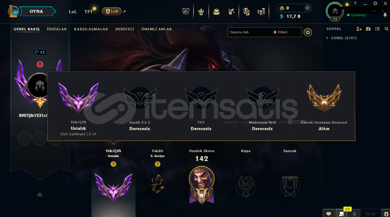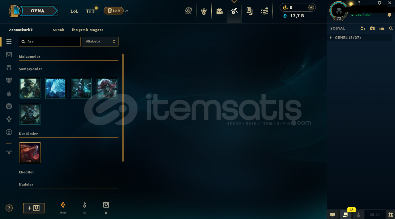 EUW MASTER HANDMADE ACCOUNT elle kasılmıştır ban riski yoktur. 80 şampiyon 9 kostüm vardır. 20 üstü lp gelir daha az gider. Hesapla ilgili her şey fotoğraflarla gösterilmiştir.