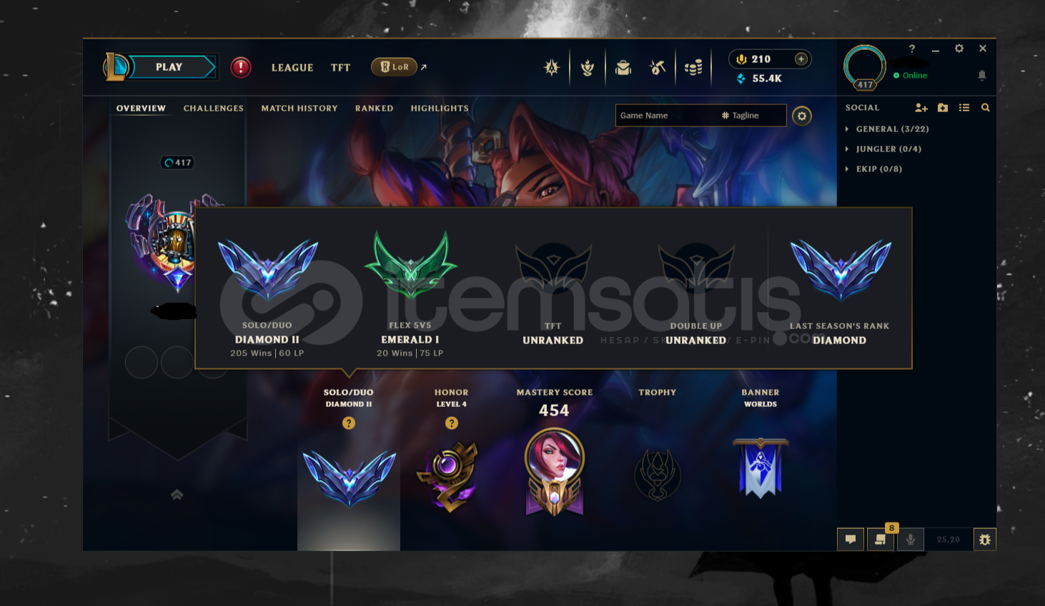 Mevcut kısıtlama veya ban durumu yoktur.Hesabın peaki Master 269LP mevcut ligi Diamond 2 60LP dirMail devri yapılacaktır hesabın her şeyi size aittir ve değişebilir.Yıllardır oynadığım kendi hesabım197 Skin Full Hero 55k Mavi öz 210rp bulunmaktadır.Nick değiştirme hakkı vardır, 2 iade hakkı vardır.Skinler ve merak ettiğiniz sorular için Sms veya mesaj atarak ulaşabi...