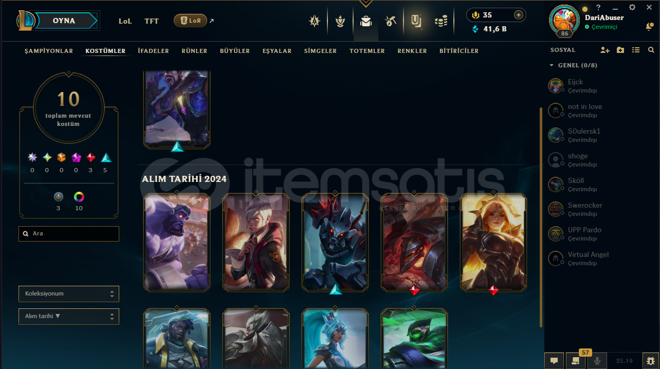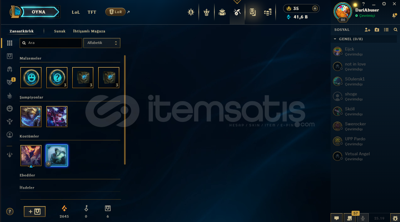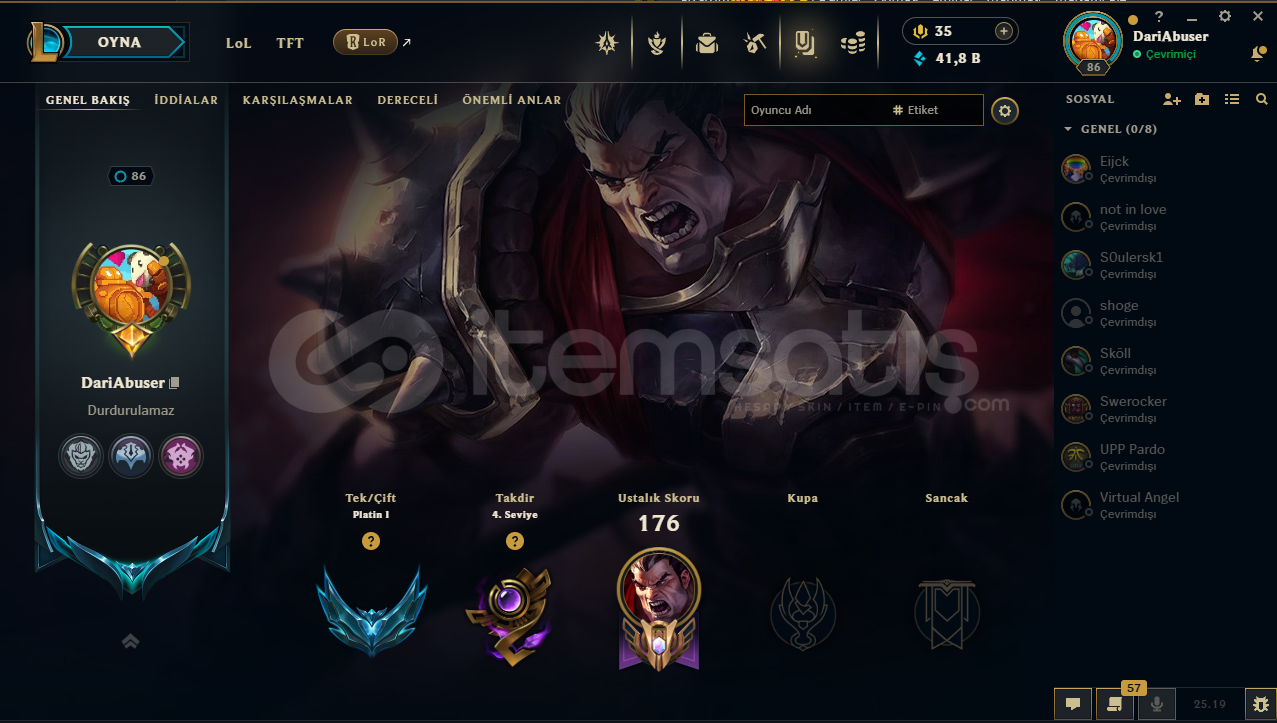 Main hesabımdır.İçinde güzel skinler bulunur resimlerden inceleyebilirsiniz.Hesab plat 1.Ortalama bi lp geliri var.Maili onaylı ama boş bir mail açtım o boş maille vericem hesabı otomatik teslimat olacaktır.