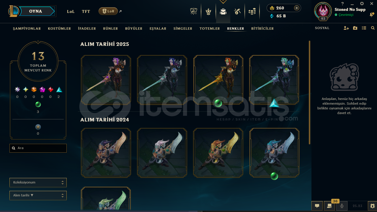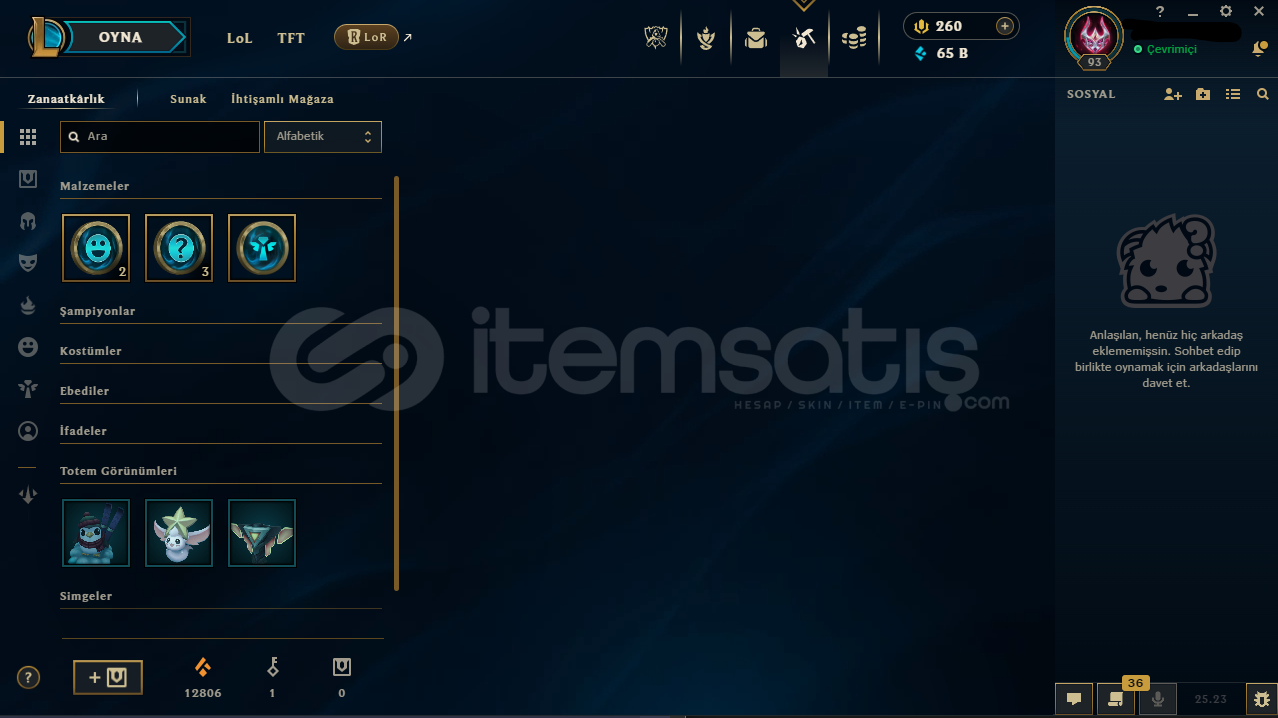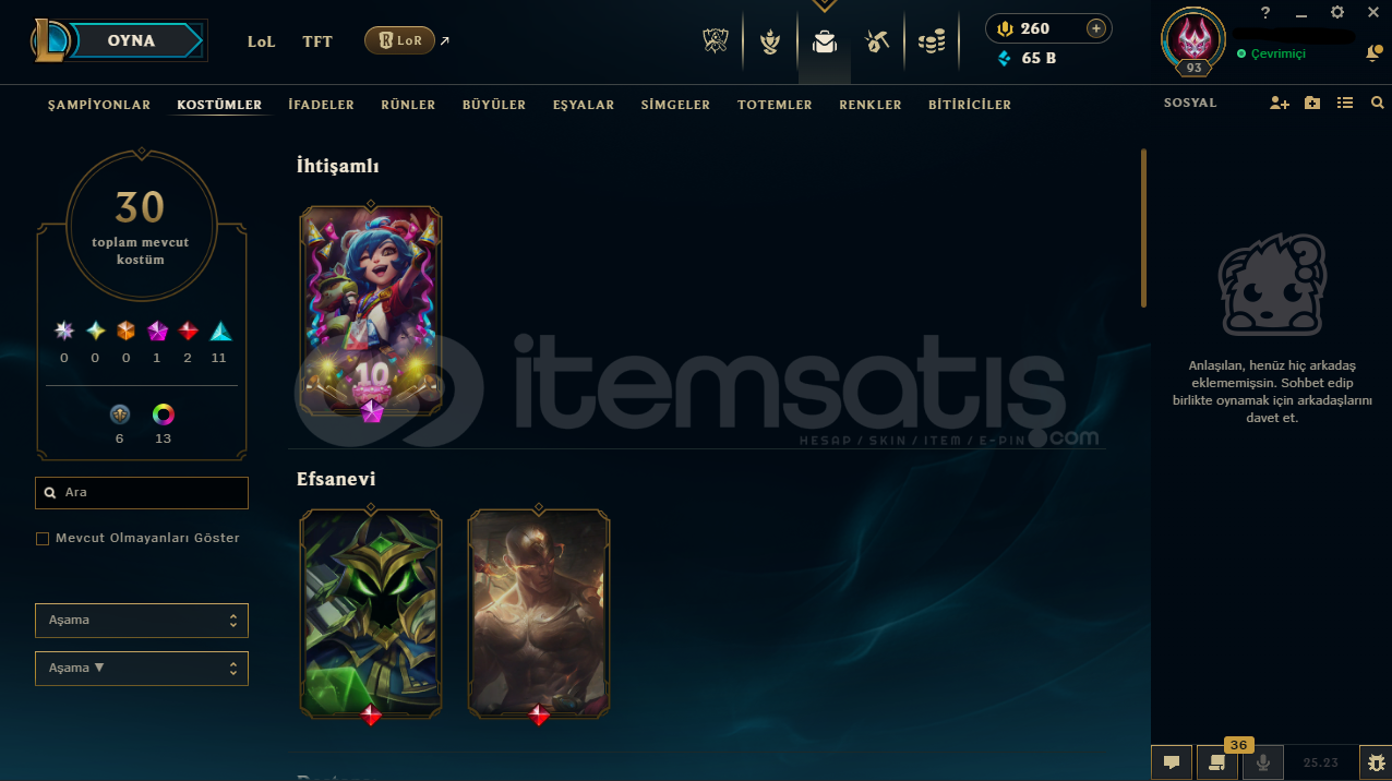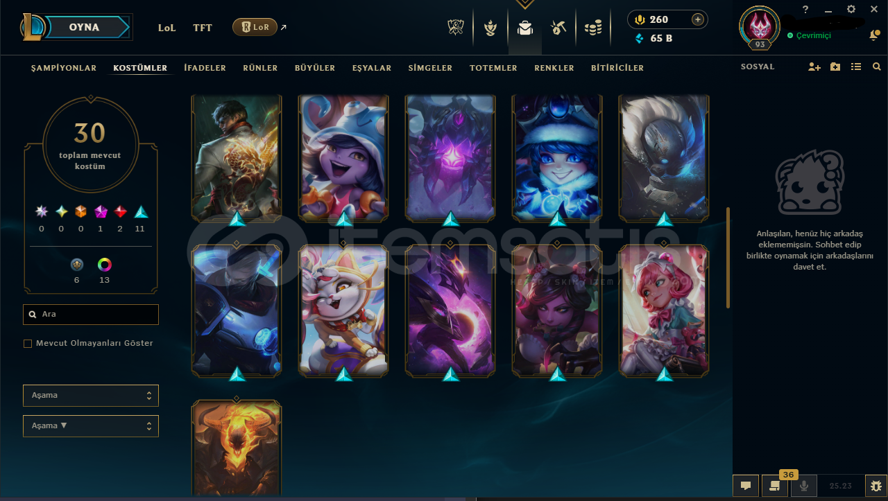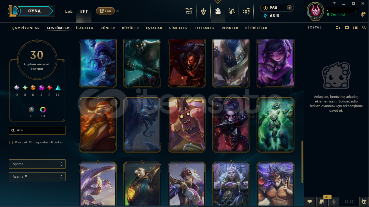 Hesabın E-Posta'sı ve Tüm bilgileri değiştirilebilir.Teslimatlar Manuel Yapılmaktadır, 7/24 satın alabilirsiniz. 6 saat içerisinde geri dönüş yapılır.Dereceli Direkt Girilebilir.65 K Mavi Öz & 12806 Turuncu Öz + 260 RP Bulunmaktadır.Hesabınızı satın aldıktan sonra sizden başka kimsenin erişimi olmaz..93 Level + PLAT I (EUW) Hesaptır.30 Kostüm ve 65 &#...