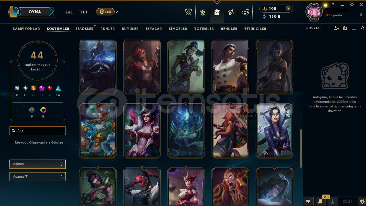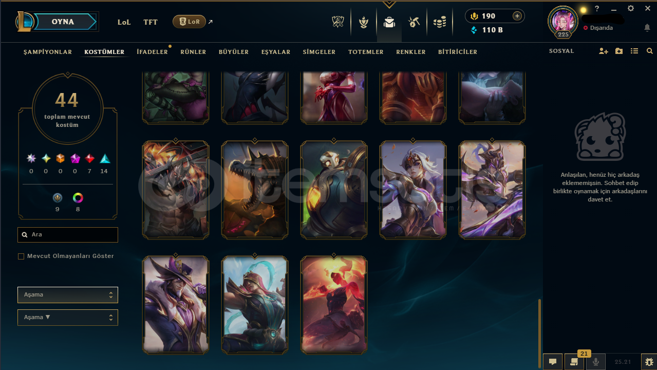 44 Kostüm + 8 Renk Paketi ve 121 Şampiyon bulunmaktadır.