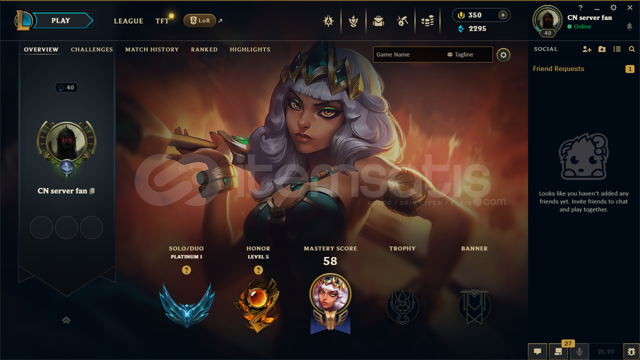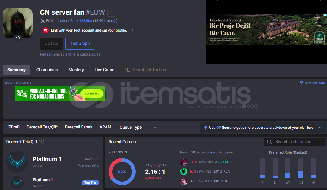 EUW PLATINUM 1 // HIGH LP GAIN // HIGH MMR Handmade hesaptır. Sezon boyunca aktif ranked atılmıştır. Banwaveden etkilenmemektedir.Yüksek MMR'a sahiptir.350 RP bulunmaktadır.Yüksek WR'ye sahiptir.38 LP almaktadır.5 LVL HONOR'a sahiptir.