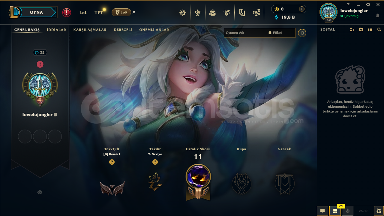 euw sunucusu hesap - s14 demir3 bitirdi - bu sezon demir1 rankedda - çok nadir bulunan hesaplardan smurf veya sıralama kasmak için ideal - 20k mavi öz - dereceli girmek için 3 maç win alınması gerekiyor -hesabın ban riski yoktur