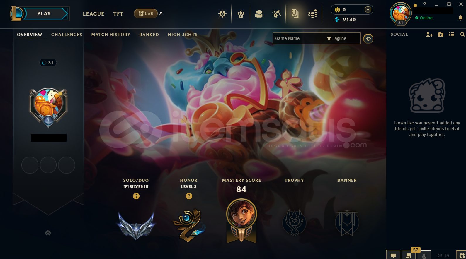 • Hesap EUW Tek/Çift Silver 3 - 56 Lp - 1 Win 1 Lose EUW LoL Hesabıdır.