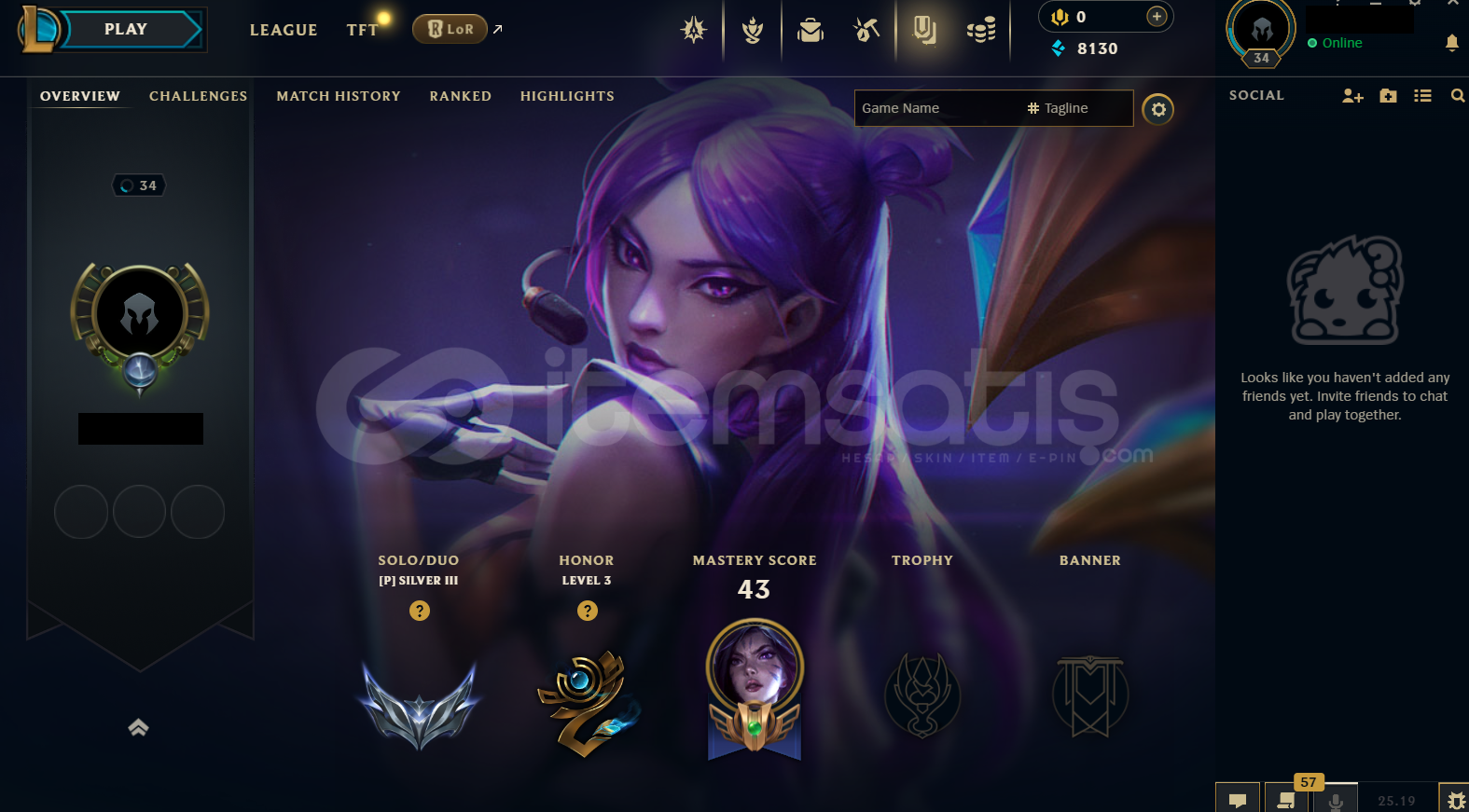 Hesap EUW Tek/Çift Silver 3 - 56 Lp - 1 Win 3 Lose EUW LoL Hesabıdır.