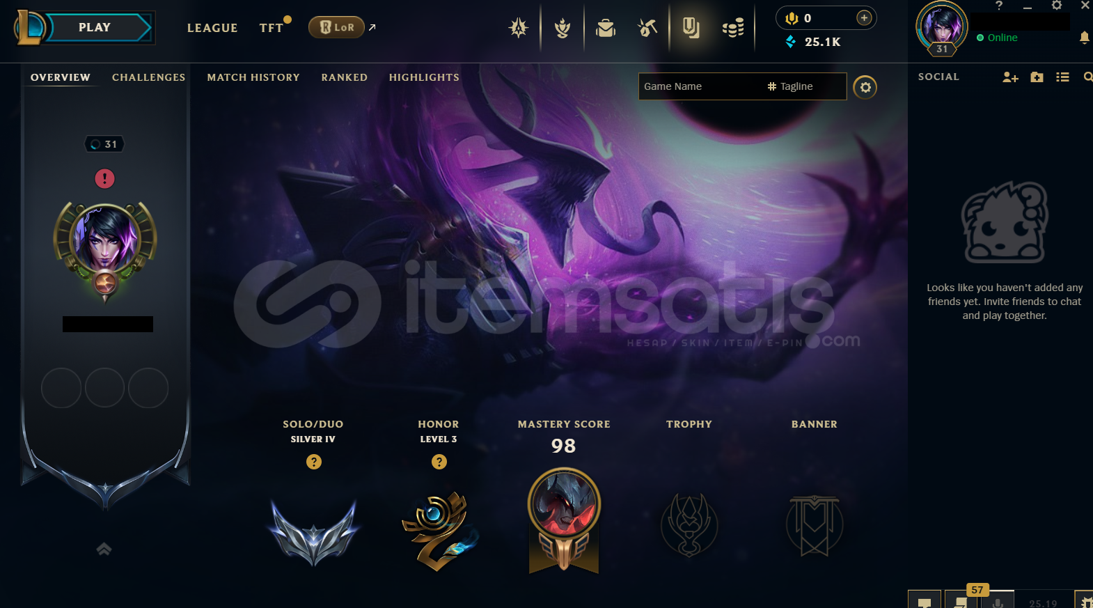 Hesap EUW Tek/Çift Silver 4 - 26 Lp - 3 Win 5 Lose EUW LoL Hesabıdır.