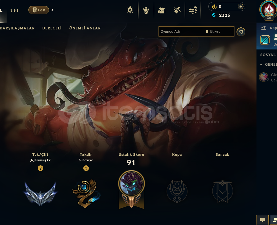 EUW SİLVER 4 / 0 W 1 L SEZON 14 HESABI 2024 DE KURULMUŞTUR30 LV37 ŞAMPİYON1 KOSTÜM1 KOSTÜM KRİSTALİKENDİ MAİLİNİZE DEVREDİLECEKHIZLI TESLİMAT---------------------------------------------Burada mısınız, hemen teslim alabilir miyim gibi sorular sormanıza gerek yoktur, aktif olmasam bile siparişinizden sonra sms geleceğinden teslimat kısa süre içerisinde yapılır.+400 Ba#...