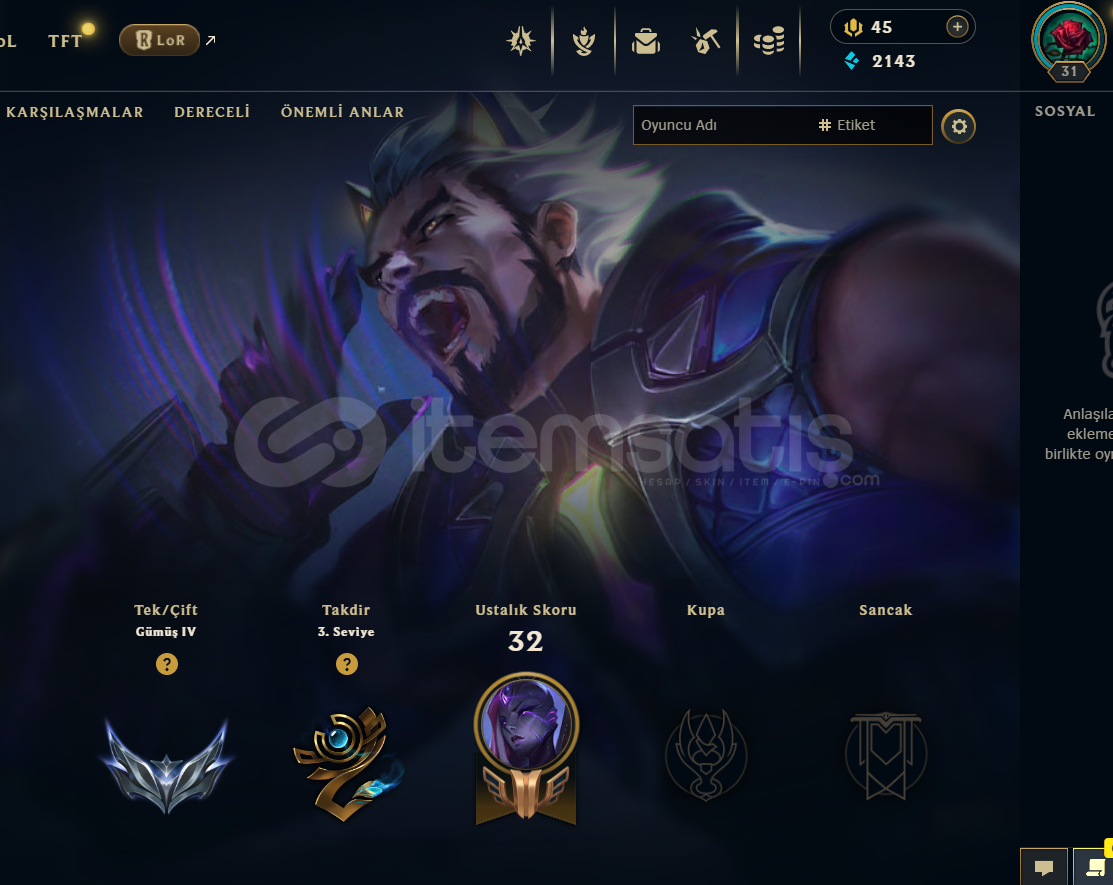 EUW SİLVER 4 / 9 W 7 LSEZON 5 HESABI 2015 DE KURULMUŞTUR31 LV31 ŞAMPİYON2 KOSTÜMKENDİ MAİLİNİZE DEVREDİLECEKHIZLI TESLİMAT---------------------------------------------Burada mısınız, hemen teslim alabilir miyim gibi sorular sormanıza gerek yoktur, aktif olmasam bile siparişinizden sonra sms geleceğinden teslimat kısa süre içerisinde yapılır.+400 Başarılı işlemimizde...
