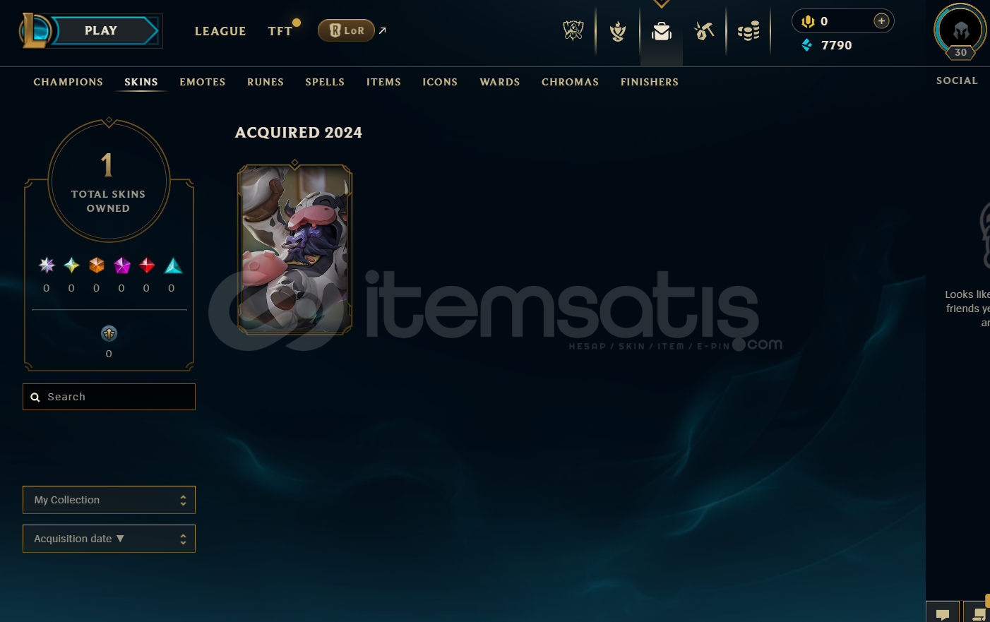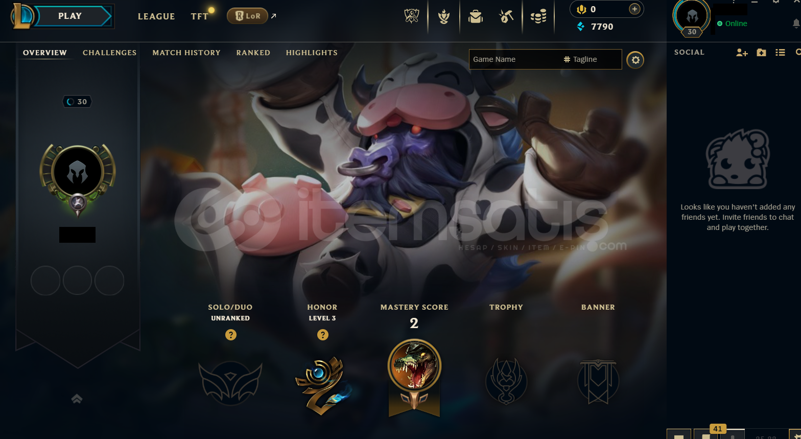 HESAP DETAYLARI:Hesap hiç ban yememiştir ve takdir seviyesi 3 dür.Hesap EUW Unranked LoL Hesabıdır.İçerisinde 7790 Mavi Öz 1 Kostüm 30 Hero ve 3 Adet İade Hakkı Mevcuttur.HESAP HAKKINDA:Kendi mail adresinize kayıt edebilir, etkinleştirmeyi kaldırabilir ve şifresini değiştirebilirsiniz.Hesaplarımızda hiç bir sıkıntı çıkmamaktadır.Herhangi bir sıkınt&#...