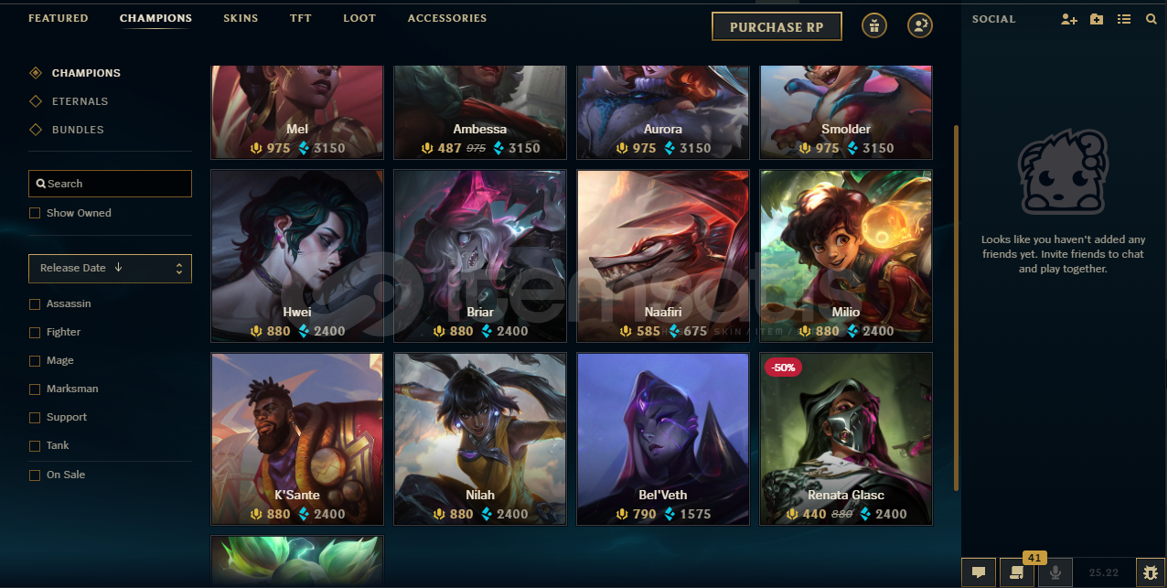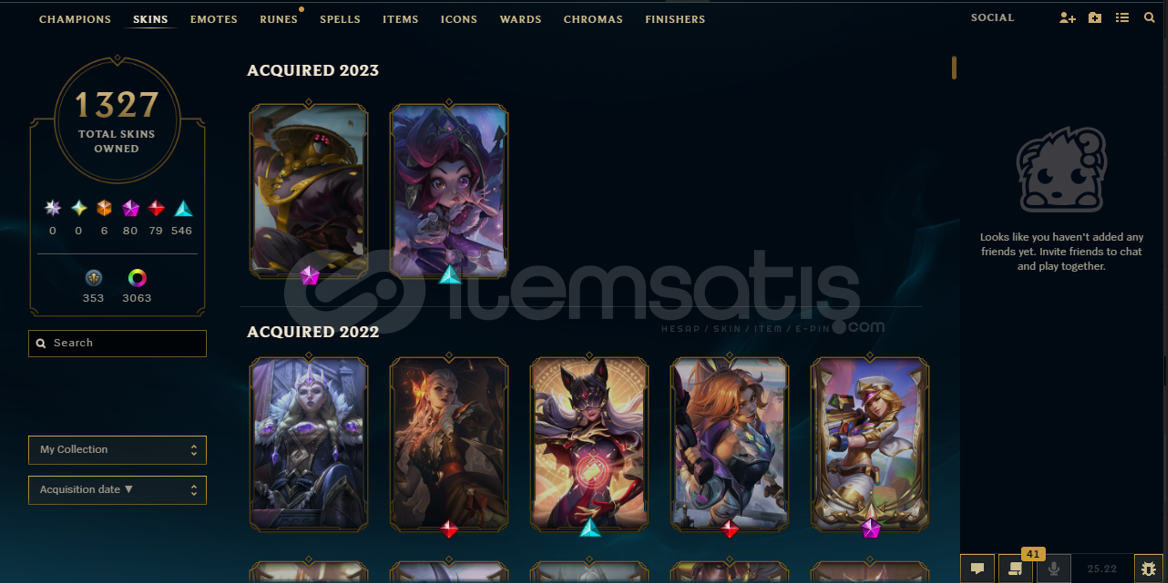 159 Champions   1327 Skins    6 Emotes65 Icons5 Ward skins3093 Chromas0 RP 1200 BE Level 3 Honor