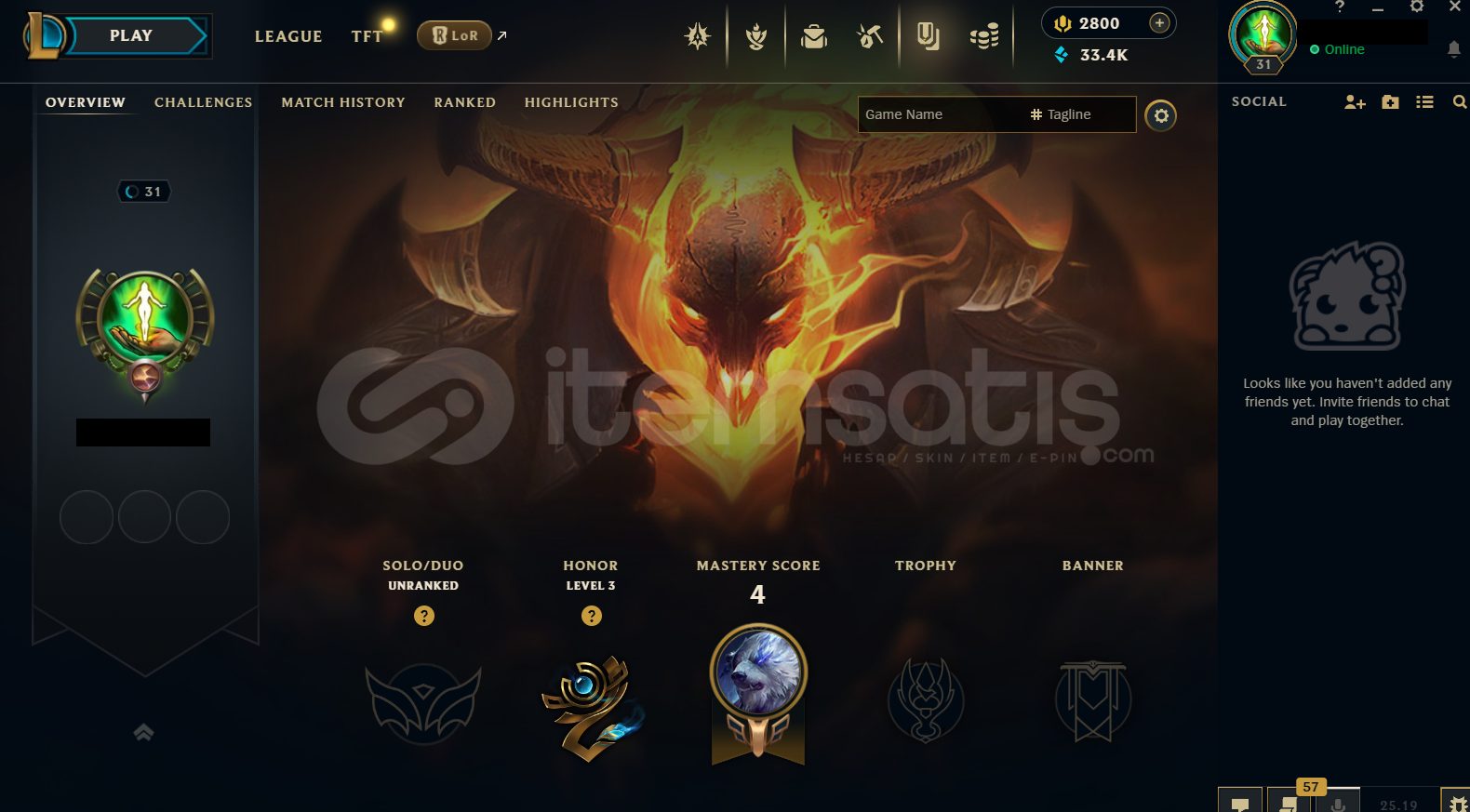 HESAP DETAYLARI:Hesap hiç ban yememiştir ve takdir seviyesi 3 dür.Hesap EUW Unranked LoL Hesabıdır.İçerisinde 2800 Rp 33400 Mavi Öz 2 Kostüm 25 Hero ve 3 Adet İade Hakkı Mevcuttur.HESAP HAKKINDA:Kendi mail adresinize kayıt edebilir, etkinleştirmeyi kaldırabilir ve şifresini değiştirebilirsiniz.Hesaplarımızda hiç bir sıkıntı çıkmamaktadır.Herhangi bir sık&...