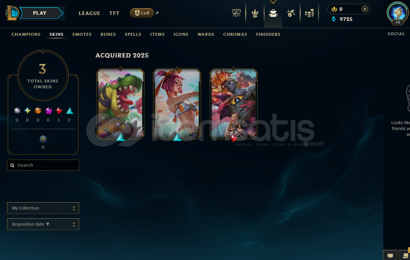 HESAP DETAYLARI:Hesapta 3 Oyun Dereceli Ban Vardır.Hesap EUW Unranked LoL Hesabıdır.İçerisinde 9725 Mavi Öz 3 Kostüm 29 Hero ve 3 Adet İade Hakkı Mevcuttur.HESAP HAKKINDA:Kendi mail adresinize kayıt edebilir, etkinleştirmeyi kaldırabilir ve şifresini değiştirebilirsiniz.Hesaplarımızda hiç bir sıkıntı çıkmamaktadır.Herhangi bir sıkıntıda en iyi desteği ...