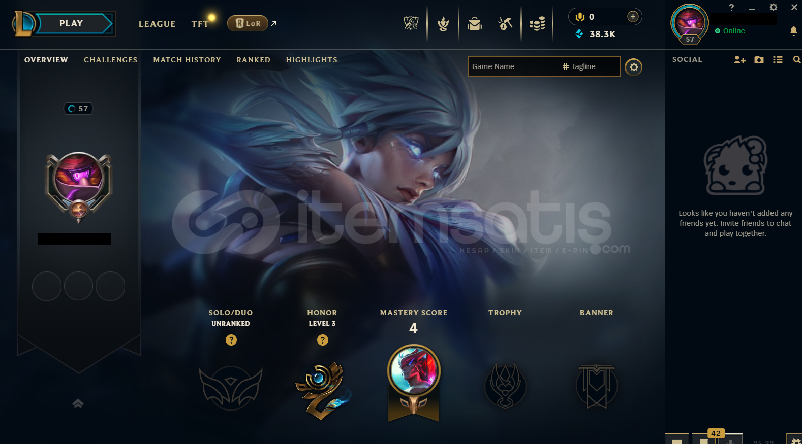 HESAP DETAYLARI:Hesap hiç ban yememiştir ve takdir seviyesi 3 dür.Hesap EUW Unranked LoL Hesabıdır.İçerisinde 38390 Mavi Öz 7 Kostüm 26 Hero ve 3 Adet İade Hakkı Mevcuttur.HESAP HAKKINDA:Kendi mail adresinize kayıt edebilir, etkinleştirmeyi kaldırabilir ve şifresini değiştirebilirsiniz.Hesaplarımızda hiç bir sıkıntı çıkmamaktadır.Herhangi bir sıkınt&...
