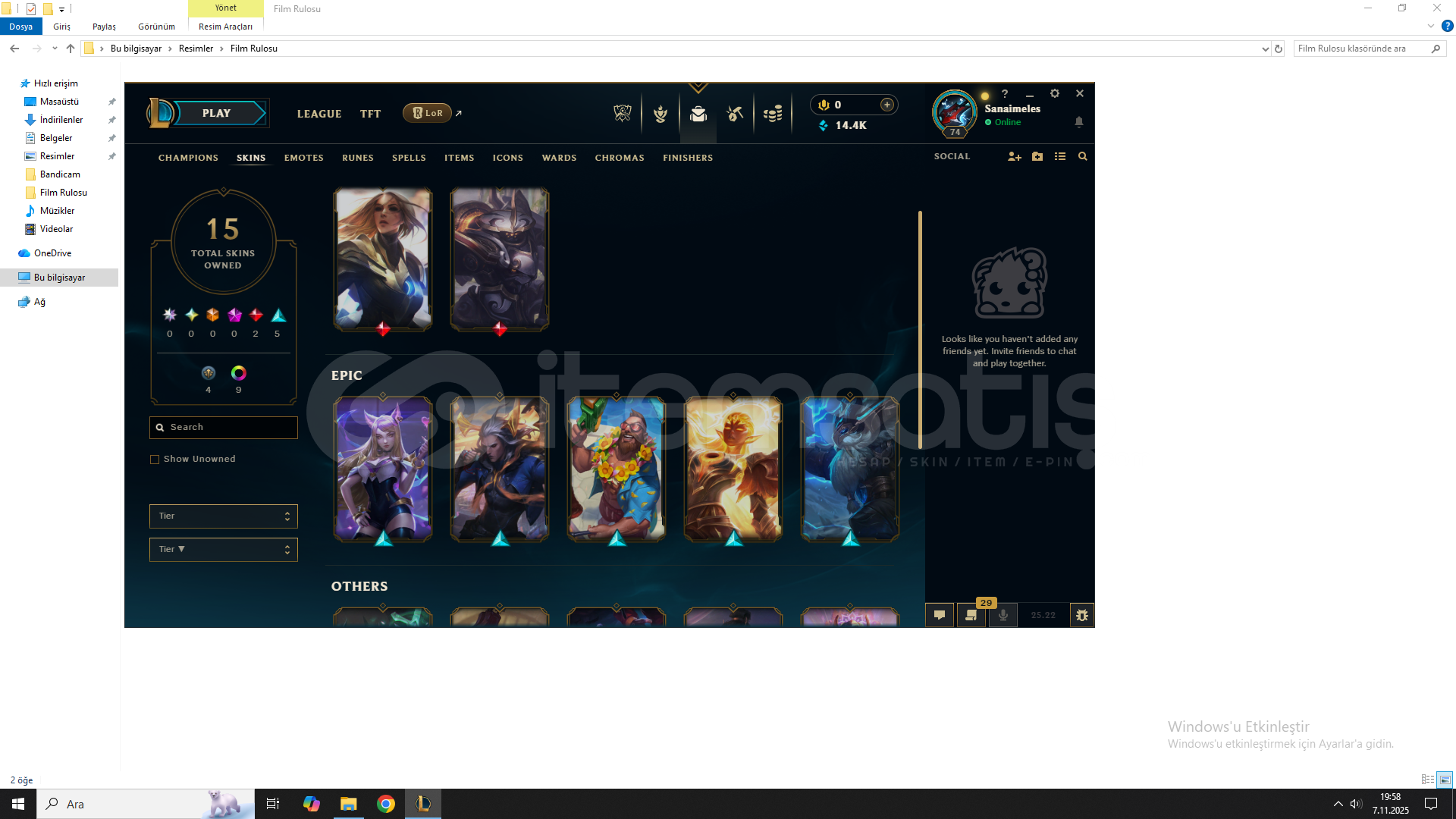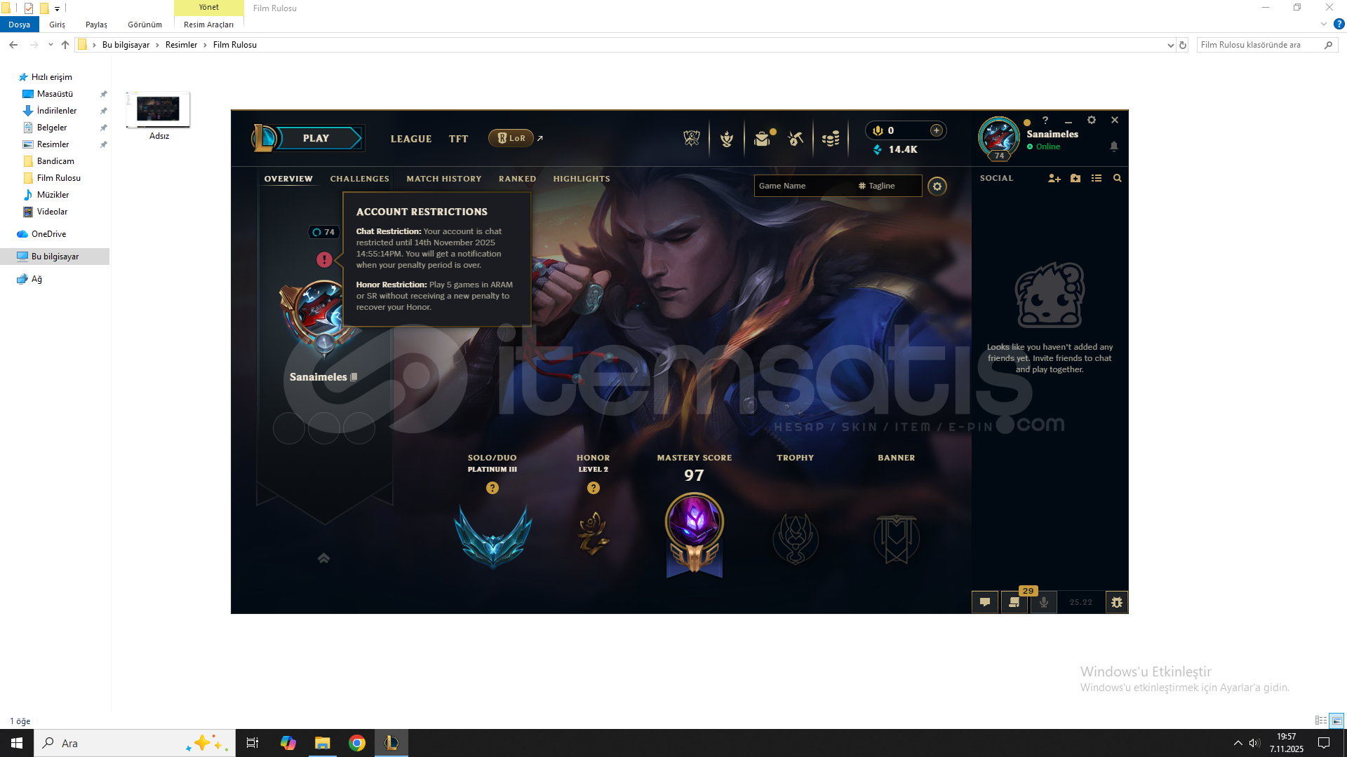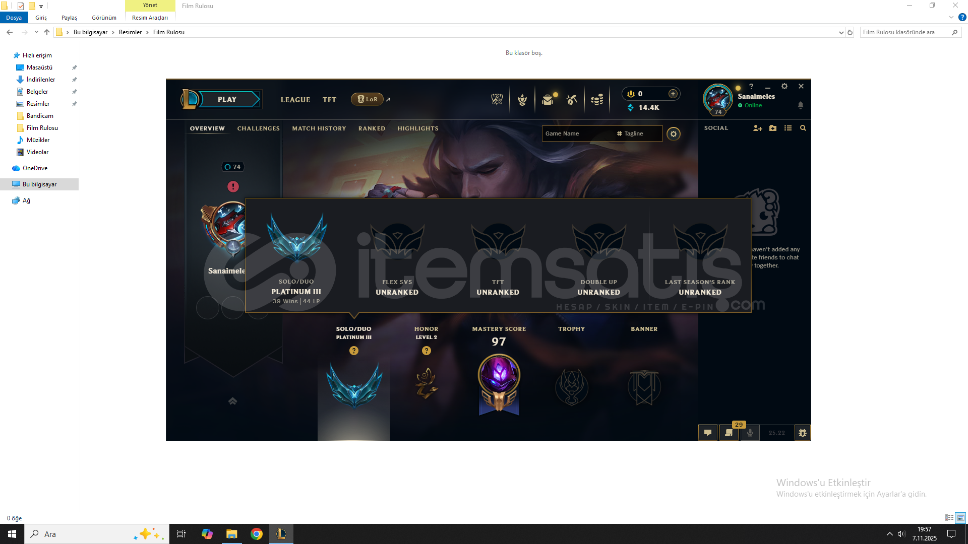 westte plat 3 dür hesabım güzel skınler vardır wri yüksektir 15k be vardır çet banı vard sadece 1 haftalık ranked falan girebılırsınız hiç bi sıkıntı yok sadece çet banı 1 haftalık oyuzden uygun tuttum